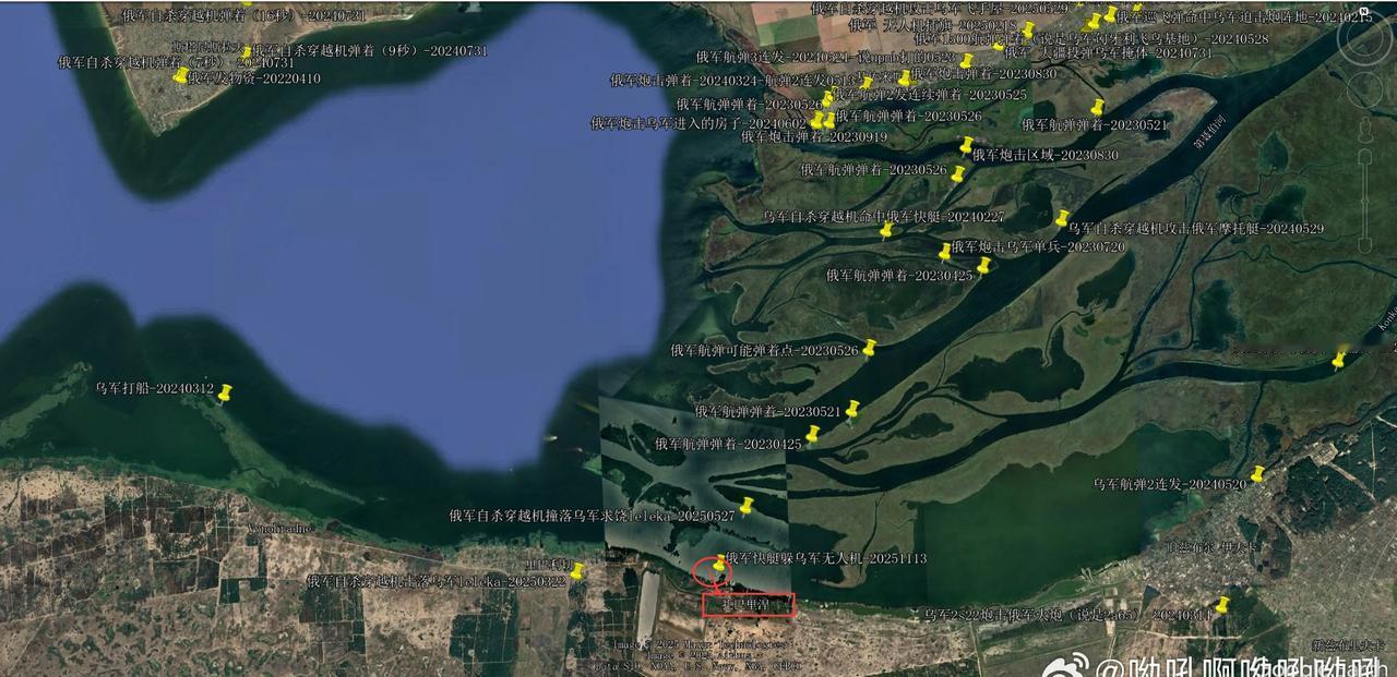 今日俄方频道热贴,快艇带着人在 第聂伯河入海口躲乌军的自杀穿越机。 这快艇有干扰机,剪辑的很乱,不知道有没有重复镜头,我数了大概13+的乌军自杀穿越机。2分30秒可以认出船已经开到左岸边上, 46.470913° 32.286779°,扎巴里涅Забарине,离对岸9公里多~还在尽力躲一下。这种就类似那些在后方运输物资人员的的皮卡~看植被可能今年夏秋或者去年夏秋之季~俄国人注意到驾驶员腿上预装了旋转止血带。 看个热闹