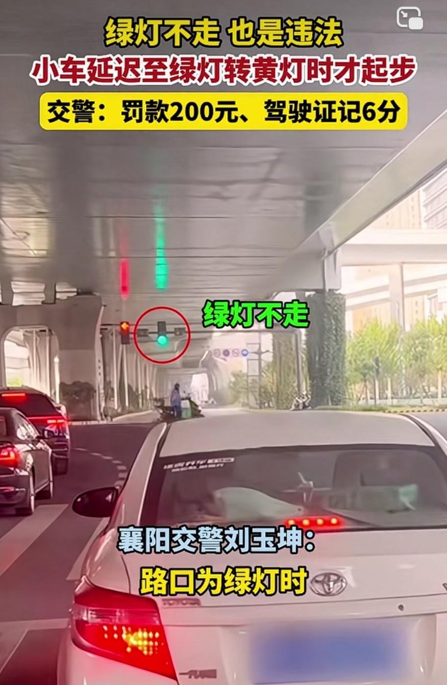 遇到绿灯不走与闯红灯是一样的违法。 襄阳交警刘玉坤告诉我们:我们经常收到绿灯不走的举报。也就是绿灯亮起时不走,当绿灯快要结束时,才启动。导致后面车辆无法通行。 他说:绿灯不走跟闯红灯均属违反交通信号灯指示。罚款200元,记6分。 实际中确有个别司机,或搞恶作剧,或是路怒症,或是开车走神儿,故意或无意在路灯亮起时压车,待绿灯快要结束时,迅速通过,导致后面的车辆无法通行。人为造成车辆拥堵。 这样的行为很无耻,也让后面的车辆很无奈。遇到这样的情况,一定要举报,让他们得到应有的处罚。