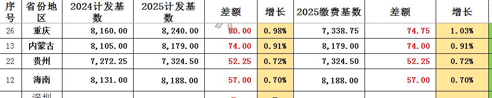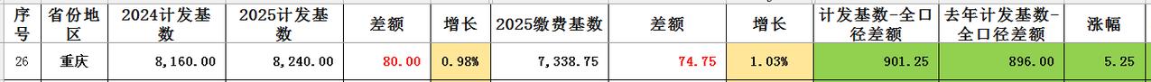 重庆2025年计发基数已使用! 重庆2025年计发基数已经出现在核定表上,根据最新核定表,重庆的2025年计发基数为8240元! 2025年比2024年计发基数增长80元,涨幅为0.98%,不及缴费基数的增长1.032%。 计发基数与缴费基数二者之间的差额从896元增长到901.25元,增加了5.25元。 比重庆涨幅还低的有海南、内蒙古、贵州。 但这三个省份均为过渡完毕使用全口径的省份。