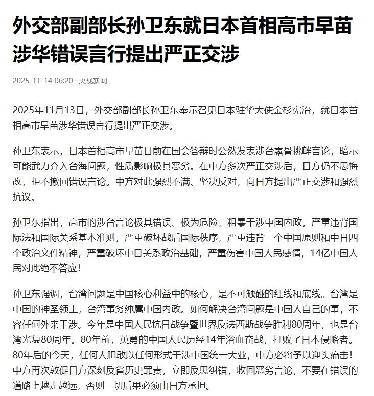 高市早苗涉台言论还在持续发酵,据悉中国军号和中国外交部发言人的官方账号,都接连用日文发贴表示:如果日本武力介入台海,必遭迎头痛击。与此同时,外交部副部长孙卫东,也在11月13日,奉示召见日本驻华大使金杉宪治,就日本首相高市早苗涉华错误言行提出严正交涉。 其中要注意的这个词,奉示召见,说直白点,这是比外交部副部长更高级别下达的指示!可见高市这番言论之后,中国从上到下的反应到底有多强烈。现在头疼的其实不是咱们,而是日本!而是高市早苗。 据悉,日本前任首相石破茂也在11月13日,对高市早苗日前在国会发表的涉台言论表示反对,随着石破茂的加入,应该有三位日本前首相表态反对高市早苗的言论了。石破茂是这样说的,高市的言论几乎等同于“台湾有事就是日本有事”。 而除了日本这边给到高市压力之外,美国对于高市早苗的涉台言论也是不予支持的,特朗普一句我和中国的关系很好,直接打碎了高市早苗的所有幻想。 虽然高市早苗已经表态,以后不会在谈论这个话题,但是中国有句老话,枪打出头鸟,既然说了,哪有草草了事的可能,中国不会惯着高市早苗,不会让这种干涉中国内政的风气在日本冒头,这回我们势必会让高市早苗长长教训,也让日本方面明白,在台湾问题上挑衅中国,到底意味着什么。