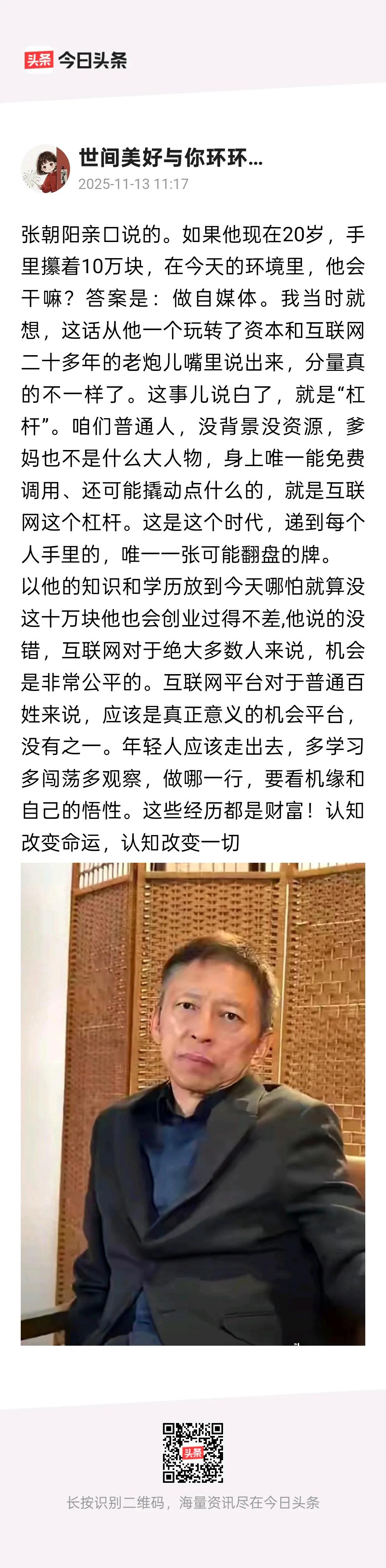 20岁,10万块本钱,放在现实社会当中确实干不了啥,也只能做做自媒体。 这篇文章的观点说的也挺有意思,说是张朝阳说的。 是不是张朝阳说的这话也未可知,但是对于普通人来讲,20岁拥有10万块钱本钱,已经很了不起了。 但是放在社会现实生活当中,有这10万块钱好像也干不了什么大事儿,最多就是在自媒体圈里折腾折腾。 要知道20岁最大的优势是年轻。 在互联网上创业,需要最多的就是耐心,就是时间就是等待。 互联网确实对每个人都是公平的,无论你是哪个年龄段的,也无论你是现在哪个行业,也无论你是什么样的学历,只要你愿意钻研,只要你肯于发现,你肯定能够在互联网上找到属于自己的赛道。 当然这条路也很困难,也不是说每个人都能出类拔萃。 但对于一个20岁的年轻人来讲,除非在名牌大学就读,以后有很好的工作机会,其他好像也没有什么好的选择。 在现实生活当中,这10万块钱交个两年房租可能就啥也不剩了,所以要想折腾点事儿还是很难的,要想创业更不用谈。 今天的互联网确实非常便捷,也给了很多人在家上班在家折腾的机会。 如果成功了自然是好的,如果是失败了,个人也能获得成长,反正里外都不亏。