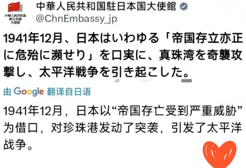 中国驻日大使馆官方发了一条推文,其中一句话,直接让日本政界哑口无言,心里发凉。   事情的起因是日本右翼高市早苗跳出来喊,如果没有所谓的“反击能力”,日本就完了,而这种“国家危机”说法日本在历史上玩过好多次,1941年不就是当年那一套?当时日本领导人也对外宣称国家到了生死关头,结果直接把战争扔到了整个太平洋,珍珠港一炸,美国也被拉下水了。   这回中国使馆没废话,用事实说事把高市那种说法和珍珠港的历史连在一起,看到这条推文的人都能直接联想到过去那段血的教训,日本现在口口声声“防卫”,可仔细看他们玩的都是突破和平宪法的政策,宪法九条明明写着不许打仗,近几年日本不光把自卫队规模扩了,预算也飙起来了,对外宣传都在说要应对所谓的地区威胁,偌大的军费和技术升级怎么都不像单纯自我防护。   不单中国关心这些,日本的老盟友美国也记得当年珍珠港,美国对那次袭击记忆深刻,损失惨重,如今日本又让“反击能力”这种说法成了主流,难免让美国有些警惕,毕竟朋友都可能突然变脸,谁也不能完全放心。   日本政客现在动不动拿“生存危机”炒作民众情绪,跟1930年代闹事时候几乎一模一样,先制造舆论,再把一切军事扩张扯上防御,这样就能堂而皇之挑战战后束缚,高市这类人嘴上说关注国家安全,实际上是想让日本能名正言顺“反击”,甚至出海作战。   中国大使馆这次的做法用历史把今天的问题摆在日本人和全世界眼前,不是警告而是提醒所有人,历史的路不能再走第二遍,这条推文让右翼政客的真实意图一览无余。   对中国来说历史造成的伤痛不能被忘记,地区和平发展的前提就是警惕军国主义复活,哪怕日本政府最近在对外合作或者搞经济安全法,都不可能让人无视他们在武装上“蠢蠢欲动”这件事。   这场博弈现在已经不只是中日之间的事了,美国、韩国、东南亚很多国家也感受到了压力,如果日本真突破限制,东亚安全平衡就要变天,大使馆用一句事实提醒大家,这不仅是在和日本较劲,也是给所有关心亚洲和平的人提了个醒。