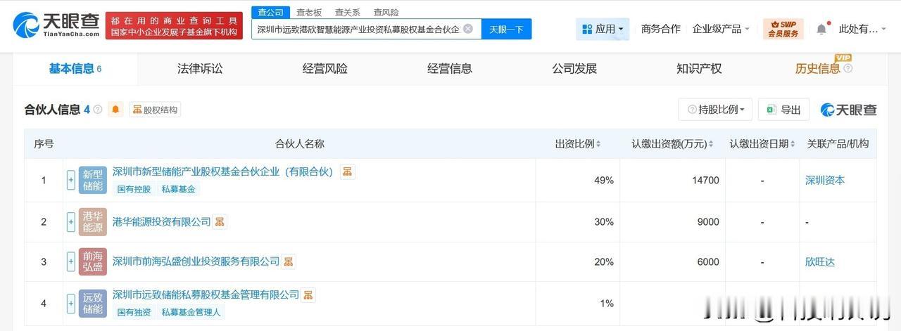 【深圳新型储能产业基金等成立智慧能源私募基金 出资额3亿】 天眼查工商信息显示,近日,深圳市远致港欣智慧能源产业投资私募股权基金合伙企业(有限合伙)成立,执行事务合伙人为深圳市远致储能私募股权基金管理有限公司,出资额3亿人民币,经营范围为以私募基金从事股权投资、投资管理、资产管理等活动。合伙人信息显示,该基金由深圳市新型储能产业股权基金合伙企业(有限合伙)、港华能源投资有限公司、深圳市前海弘盛创业投资服务有限公司、深圳市远致储能私募股权基金管理有限公司共同出资。 天眼查信息:
