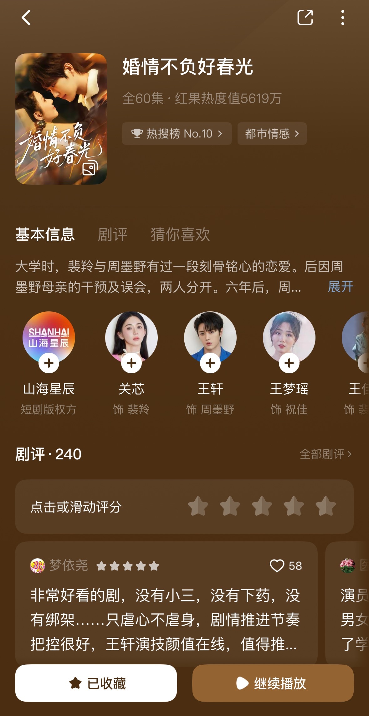 随着看得越来越多,同质化的确很严重,能看得下去的真的越来越少了。推荐这两周看完的4部!《盛世阑珊处》男女主颜值可以,剧情的话比较普通,不过整体节奏不错,打发时间可以看。《婚情不负好春光》昨晚看得印象比较深些,剧情不算新,但整体节奏很好,误会该解释就解释清楚了,不拖沓,男女主颜值演技都可,情绪到位。BGM配得也恰到好处,很多JJ的歌我喜欢。《我的毒舌真千金》整体比较欢乐也甜,有些地方逗得我大笑,很多土味情话很搞笑,不腻。《不成体统》女主挺美得。