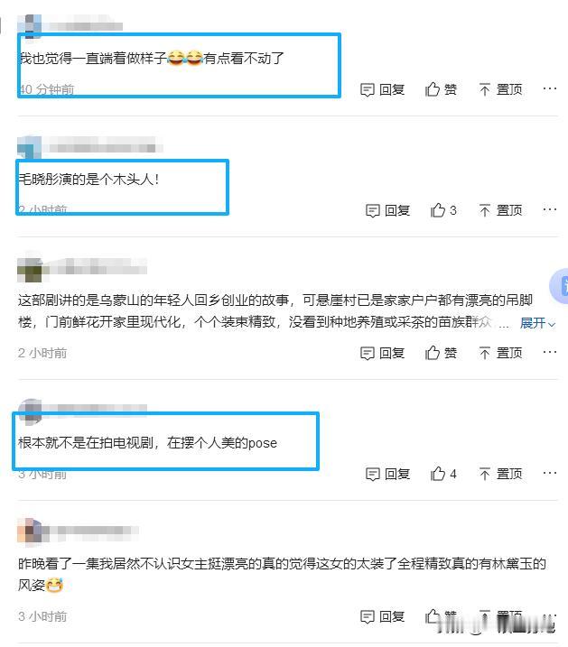 毛晓彤新剧,被嘲像木头人,太装了。 她和秦俊杰主演的《乌蒙深处》,在央一和芒果开播了,而差评几乎在她的身上 本身是一个宣传刺绣的作品,结果都是滤镜。 而毛晓彤饰演的角色衮月亮,定位是非遗苗绣传承人。 角色定位有些冷,但不是装和端着,像个没有情感的木头人。 跟人相亲时,毛晓彤一直低着脑袋、撅着眼睛,想呈现出一副娇羞的状态,但看着挺做作的。 大雨中,淋水的场面,笔直的身体,很僵硬,还把上下一样宽的身材,给暴露了出来。 怼脸时,表情不能说享受、而是很怪,不知道演的啥情景。 跟好姐们同框下,大家的状态都是松懈和自在,只有她紧绷了身体,还要呈现出腼腆的笑容。 衮月亮是非遗传承人,不是一副没见过世面、不知人间险恶、只会秀美貌的设定。 网友吐槽,根本不是在拍剧,而是在摆pose,一点都不冤枉。