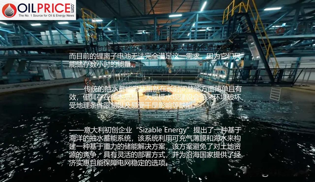 你听说过海上抽水蓄能吗?这种蓄能方式或可解决清洁能源的最大难题 全球能源存储领域正迅速发展,有望成为“清洁能源的下一个万亿美元产业”。随着全球越来越多的国家愈发依赖可再生能源来为电网供电,以及人工智能的蓬勃发展促使清洁能源的扩张成为加快能源生产速度的全方位策略的一部分,能源存储正成为在地方、国家和全球层面上保障能源安全的关键组成部分。研究人员估计,实现净零能源的未来将需要高达 6000 亿瓦时的能源存储。 目前,储能领域主要依靠锂离子电池。锂的供应体系已经十分成熟,这种材料价格合理,同时具有较高的能量效率,在各种温度条件下表现良好。像特斯拉这样的大型电动汽车公司越来越将资金和精力投入到储能业务的拓展中,因为储能已成为一个更具盈利性和更稳定的选择。这些锂离子电池组的规模也在迅速扩大,大型电池在市场和实际应用中占据了重要地位。 尽管锂离子电池已几乎无处不在,并且具有诸多显著优势,但仅靠它们自身是不足以保障能源安全和电网稳定性的,因为随着全球能源向电气化方向发展,这一问题愈发严峻。即便是最大型、最强大的锂离子电池储能系统,其储能时间也仅能维持约四小时。而在应对数天、数季乃至数年的清洁能源生产需求时,这显然是不够的。长时储能对于实现这一目标至关重要,但要实现这一目标的技术仍处于起步阶段。 目前处于研发阶段的长时储能电池选项种类繁多,从“将地球当作一个巨大的电池”(利用地球的重力能)到地质力学储能(GES)技术,再到在城市中心的高层建筑内悬挂巨大的重物。但在商业性和物流方面具有可行性的长时储能的领先方案是抽水蓄能。 抽水蓄能利用水泵将水抽到高处,待电网需要能量时再将水放回低处。在此过程中,水会向下流动,带动涡轮旋转从而产生电能。抽水蓄能是一种简单且已在全球各地多种场景中得到应用的技术,但其尚未真正普及,因为存在一些严重的缺点。与抽水蓄能项目相关的大型水坝造价高昂,且对环境有破坏性影响。此外,这些项目的成效还会受到长期干旱和因气候变化导致的水位下降的影响。而较小规模的抽水蓄能系统则过于昂贵,因为每个系统都需要根据其特定的地理环境进行设计和工程建造。 但一家意大利初创公司认为,它能够在避免所有这些权衡取舍的环境中建造抽水蓄能系统:那就是海洋。自 2022 年以来,Sizable Energy 一直致力于将这一想法变为现实,并且取得了显著进展。该初创公司已经进行了深海测试,并在上个月获得了 800 万美元的种子资金,用于建设一个离岸试点示范项目。 “在确切了解你们将如何部署系统之前,我们就已经开始探讨构建该系统的可能性了,” Sizable Energy 公司的联合创始人兼首席执行官曼纽埃莱·奥菲耶罗说道。“我们通过在海上部署来实现这一目标。因为水在任何地方都是相同的。” 该公司的这套系统是通过将海水沿着连接至海底的管道上下循环输送,从而实现基于重力的存储方式。Canary媒体公司解释道:“在海底和水面处会形成可充气的储水囊;从上方看,它就像一个巨大的漂浮圆环。” “该系统与陆地电网相连,并利用电力将盐水通过塑料管道泵送上来。反过来操作则能再生电力。” 如果试点项目取得成功,这将有可能成为一项具有颠覆性的重大突破,推动长时储能技术的发展。能够在海洋中部署储能设施将使开发商能够避开土地资源的竞争问题,并为全球 154 个沿海国家提供一种可能经济实惠的电网稳定性解决方案。