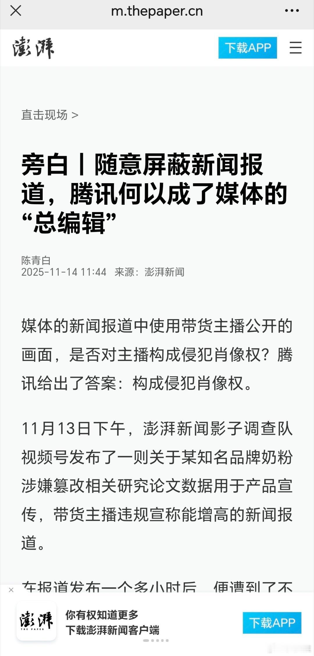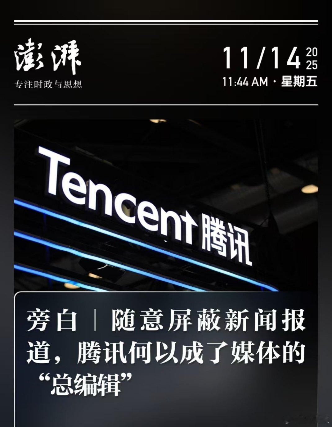 11月14日,澎湃新闻公众号发文怒批腾讯:随意屏蔽新闻报道,腾讯为何成了媒体的“总编辑”?不过,澎湃新闻的公众号这篇文章已被删除,但是,澎湃新闻官网仍然保留着。