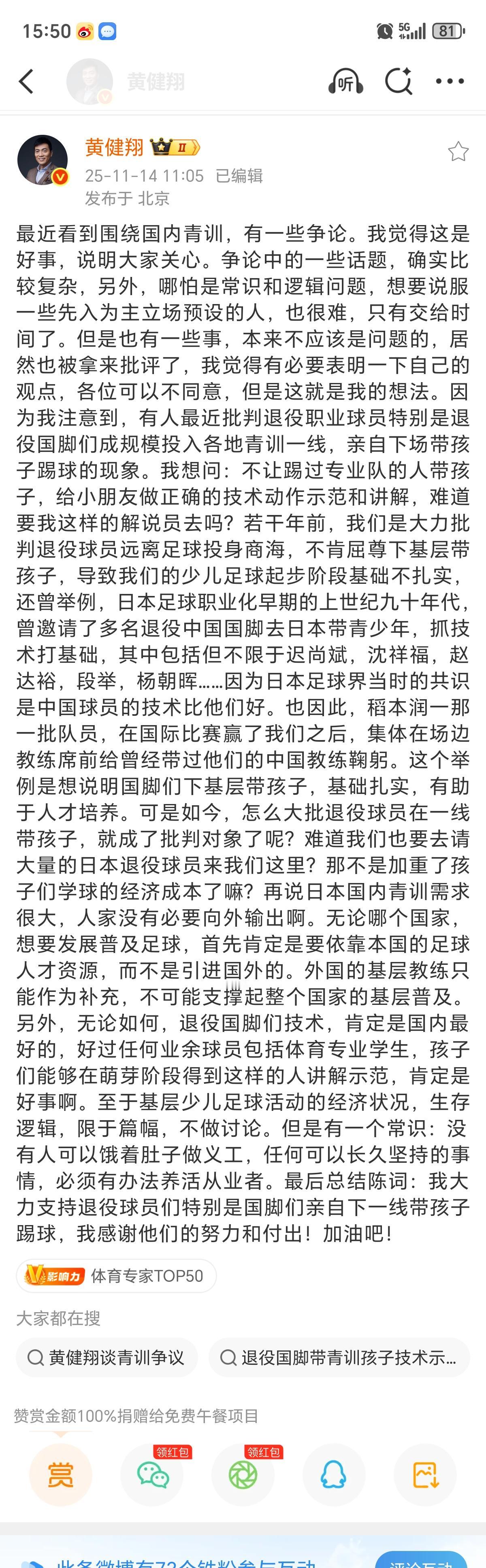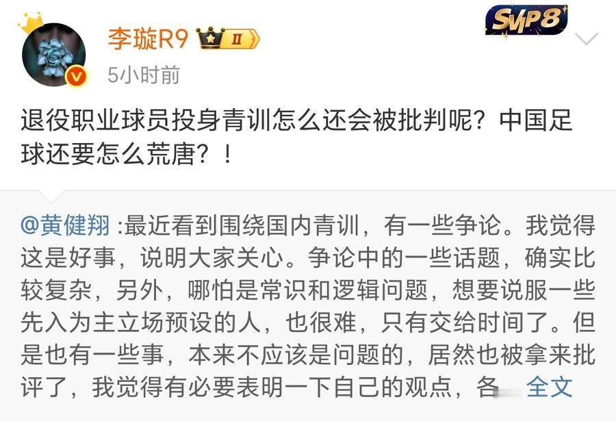 黄健翔社媒再发表对青训的看法,矛头指向董路?袁甲、潘伟力、李璇等皆做出评论,董路目前没有回应。 知名足球解说员黄健翔社媒发表了对中国足球青训的看法,表示大力支持退役国脚去带青训。并且表示不让踢过专业队的人带孩子,给小朋友做正确的技术动作示范和讲解,难道要我这样的解说员去吗?网友说黄不懂青训时,黄健翔也回复:“所以我不会去搞青训啊,专业的事交给专业的人去做啊。” 对于黄健翔的言论,知名足球媒体人潘伟力回复: “一群被洗脑的脑残走进饭店,把老板、大堂经理、服务员、清洁工、财务、前台全部逼到墙角,疯狂质问:“你们有本事去炒个菜啊!” 知名足球记者李璇:“退役职业球员投身青训怎么还会被批判呢?中国足球还要这么荒唐?” 而黄健翔社媒评论区,矛头都指向了董路,不过目前董路没有任何回应。 你觉得怎么看待黄健翔关于青训的这个言论!中超