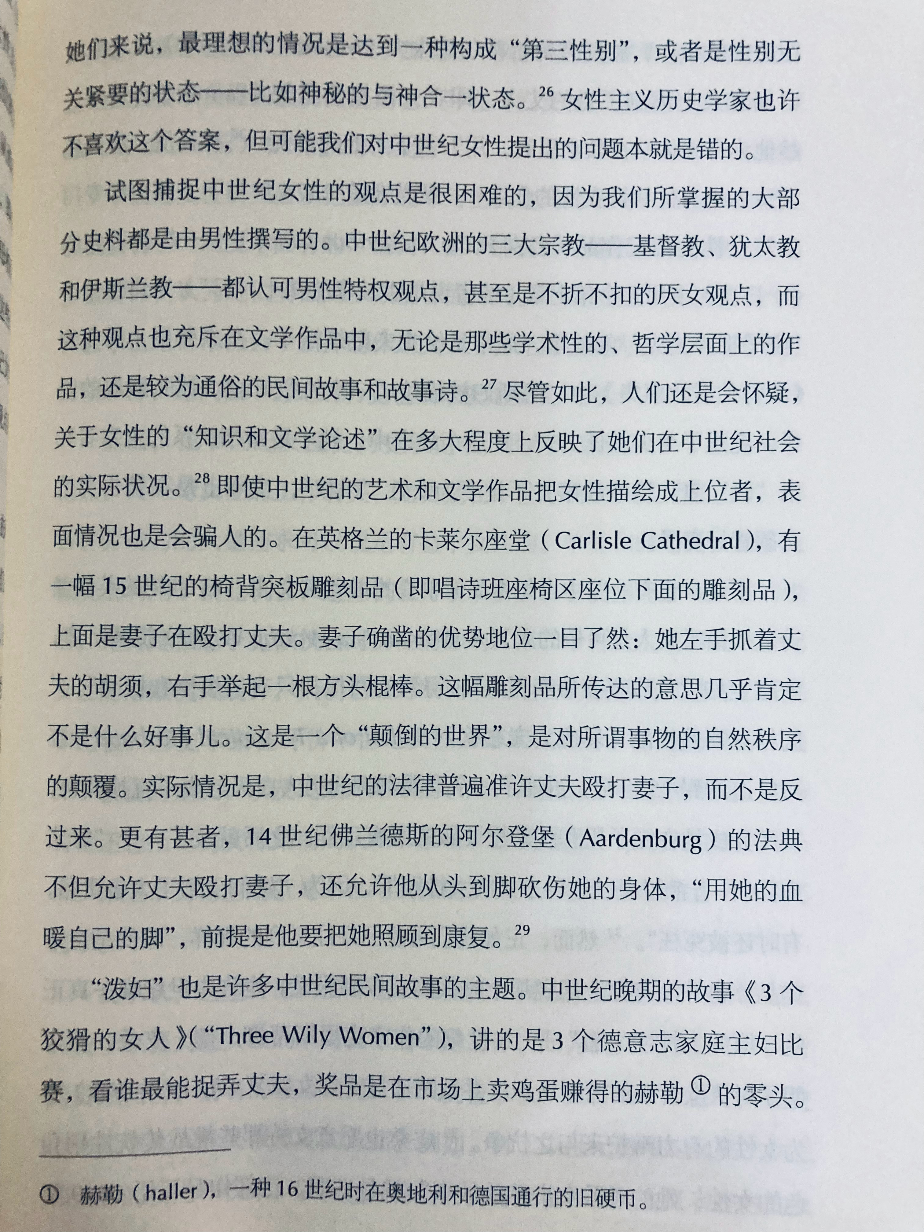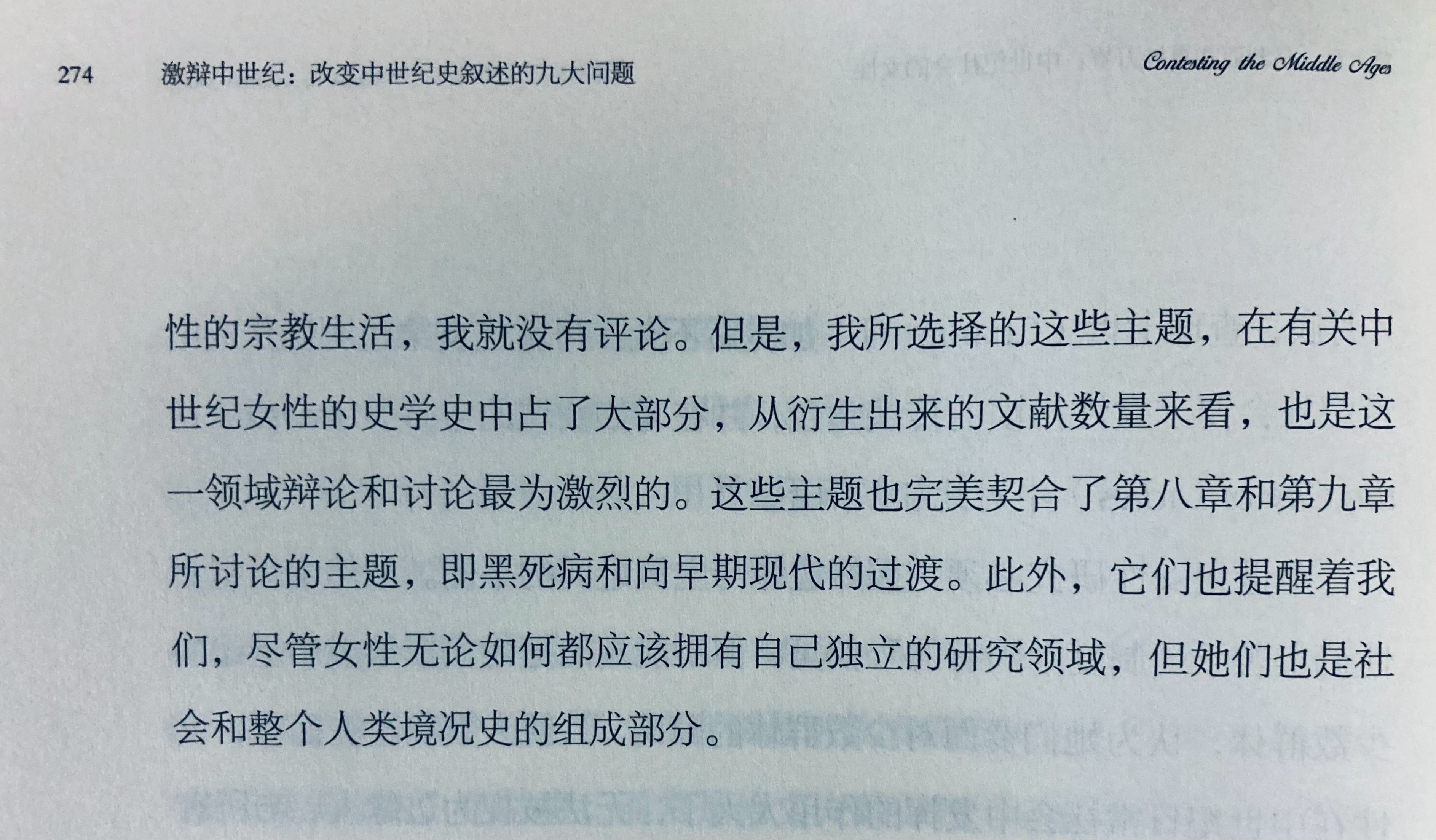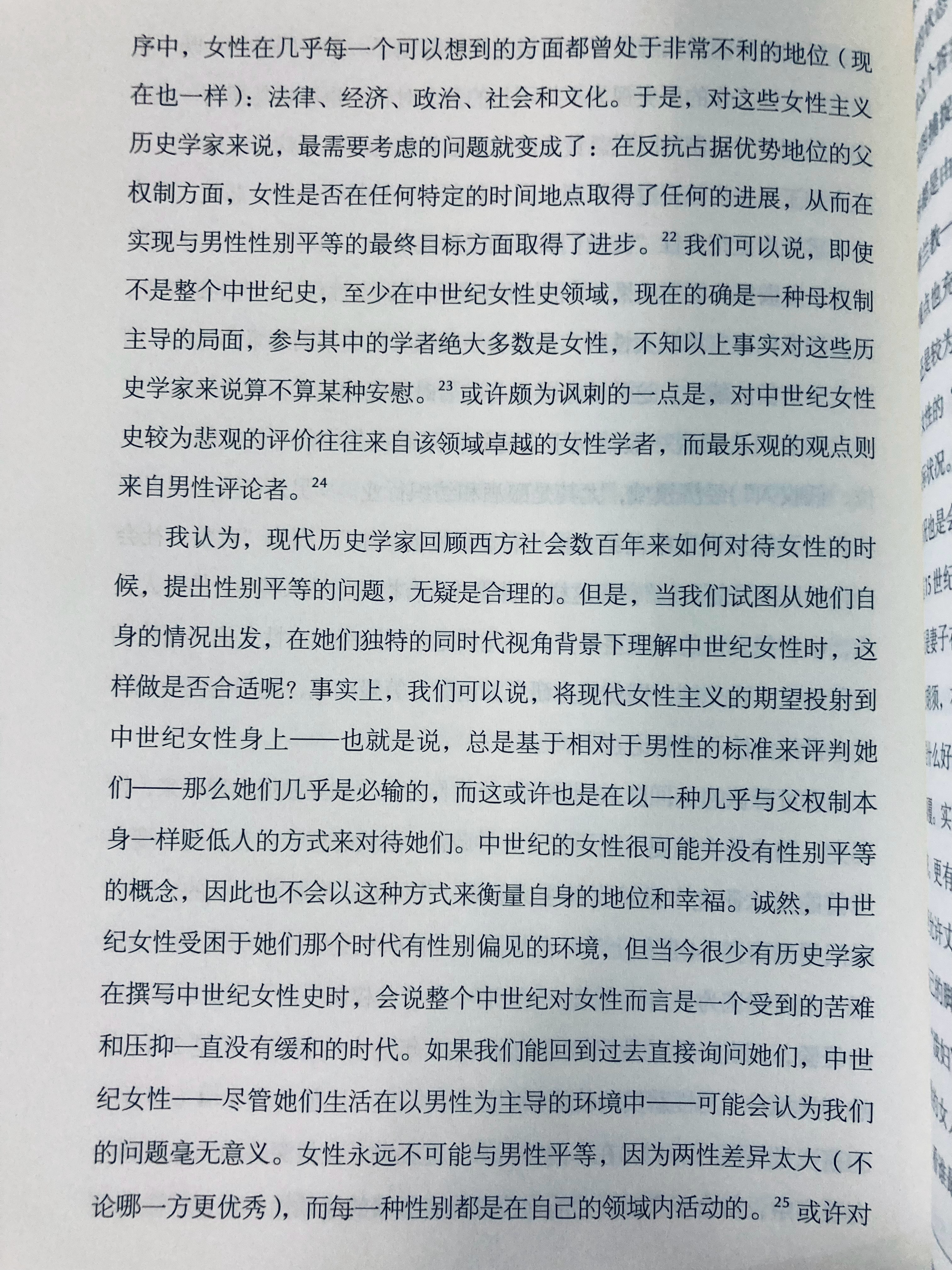 我认为,现代历史学家回顾西方社会数百年来如何对待女性的时候,提出性别平等的问题,无疑是合理的。但是,当我们试图从她们自身的情况出发,在她们独特的同时代视角背景下理解中世纪女性时,这样做是否合适呢?事实上,我们可以说,将现代女性主义的期望投射到中世纪女性身上——也就是说,总是基于相对于男性的标准来评判她们——那么她们几乎是必输的,而这或许也是在以一种几乎与父权制本身一样贬低人的方式来对待她们。中世纪的女性很可能并没有性别平等的概念,因此也不会以这种方式来衡量自身的地位和幸福。诚然,中世纪女性受困于她们那个时代有性别偏见的环境,但当今很少有历史学家在撰写中世纪女性史时,会说整个中世纪对女性而言是一个受到的苦难和压抑一直没有缓和的时代。(约翰·艾伯斯《激辩中世纪》)