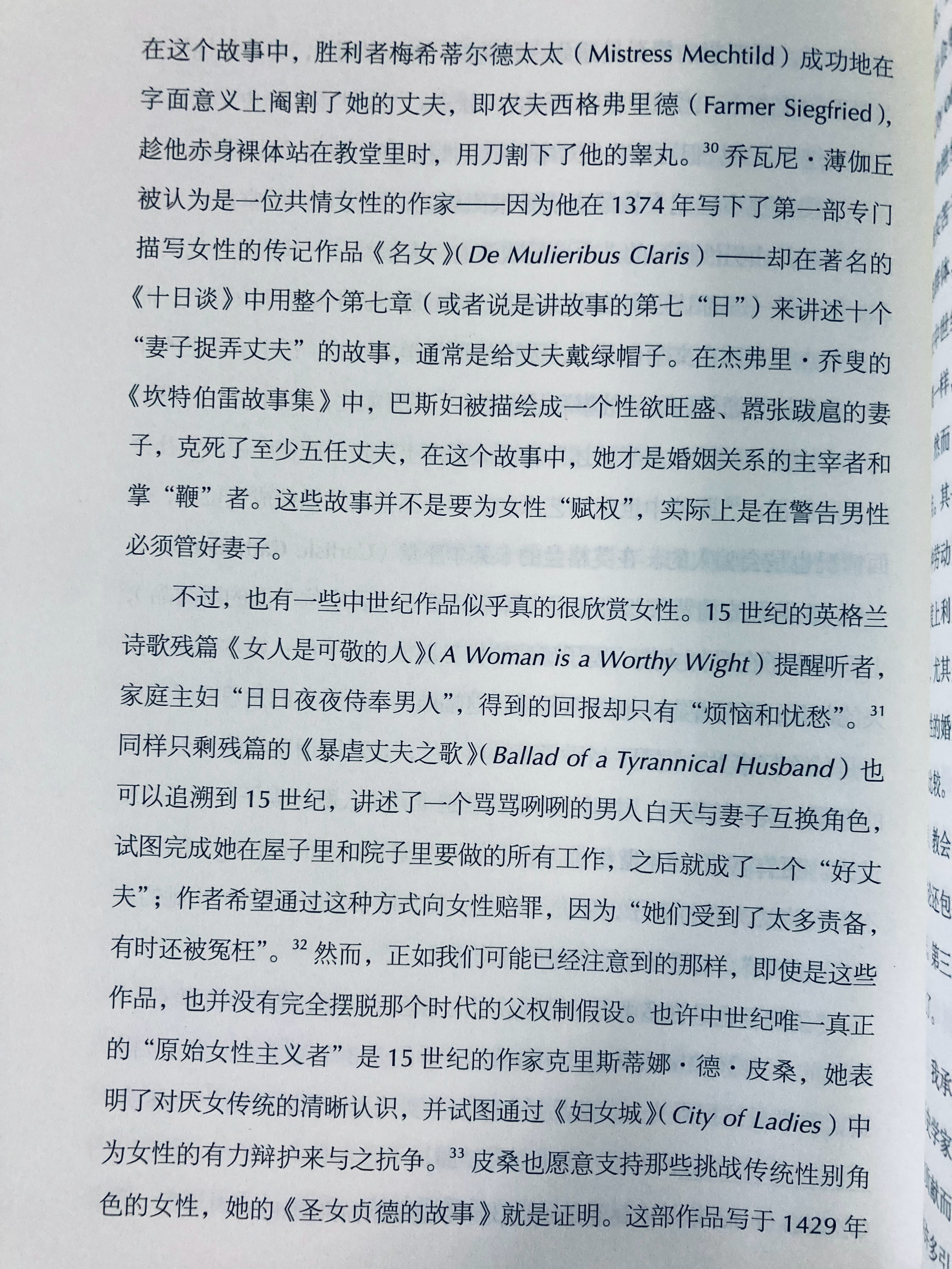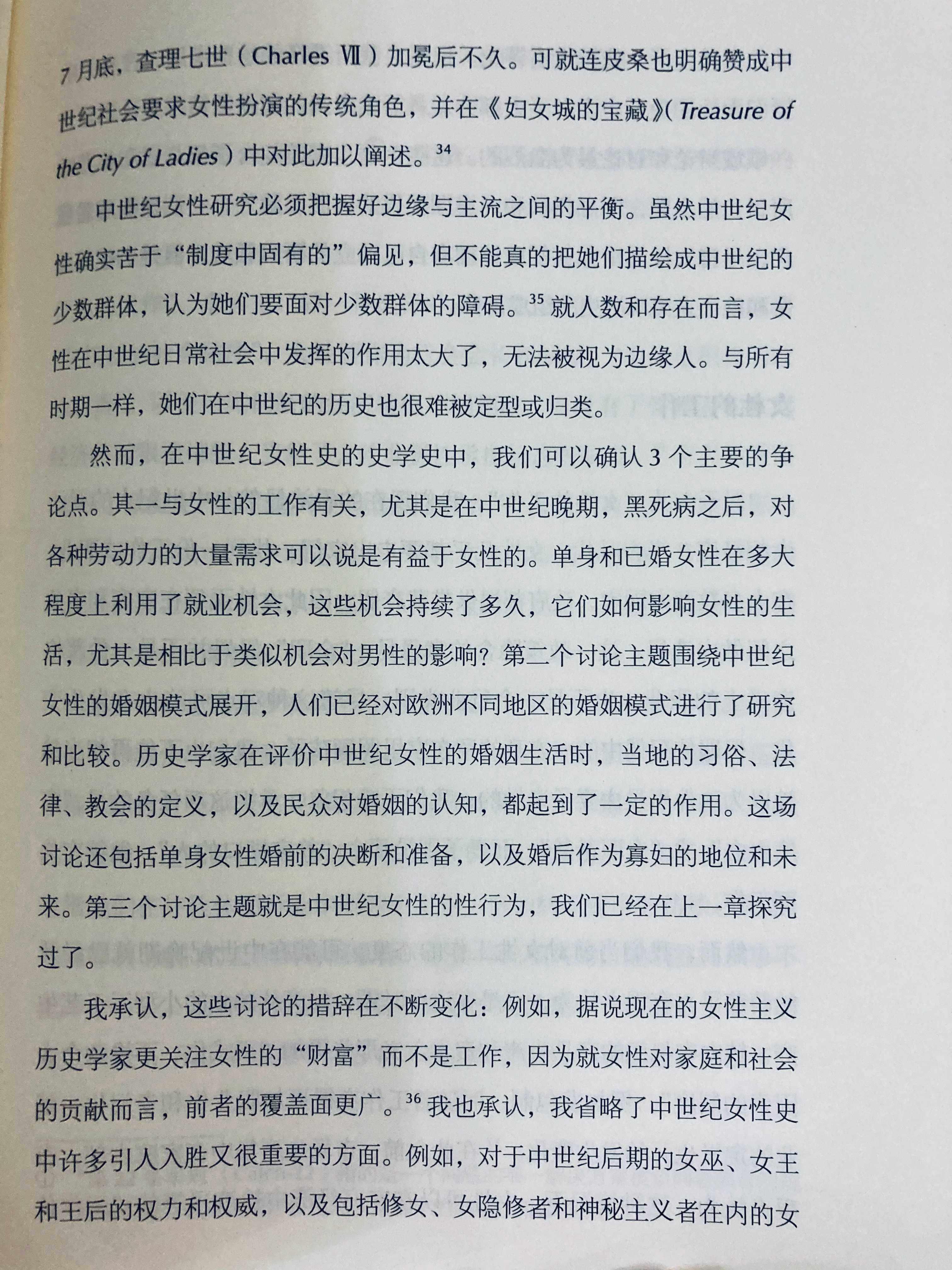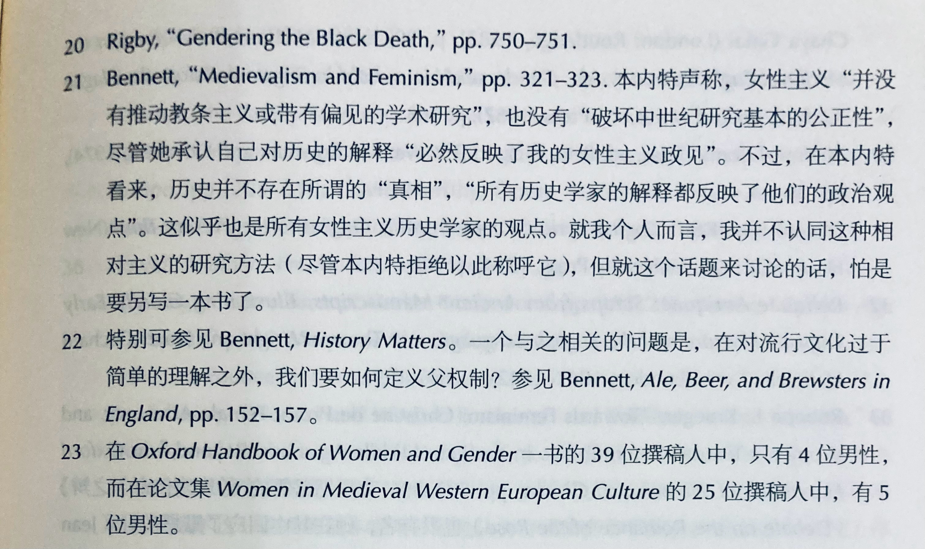 我认为,现代历史学家回顾西方社会数百年来如何对待女性的时候,提出性别平等的问题,无疑是合理的。但是,当我们试图从她们自身的情况出发,在她们独特的同时代视角背景下理解中世纪女性时,这样做是否合适呢?事实上,我们可以说,将现代女性主义的期望投射到中世纪女性身上——也就是说,总是基于相对于男性的标准来评判她们——那么她们几乎是必输的,而这或许也是在以一种几乎与父权制本身一样贬低人的方式来对待她们。中世纪的女性很可能并没有性别平等的概念,因此也不会以这种方式来衡量自身的地位和幸福。诚然,中世纪女性受困于她们那个时代有性别偏见的环境,但当今很少有历史学家在撰写中世纪女性史时,会说整个中世纪对女性而言是一个受到的苦难和压抑一直没有缓和的时代。(约翰·艾伯斯《激辩中世纪》)