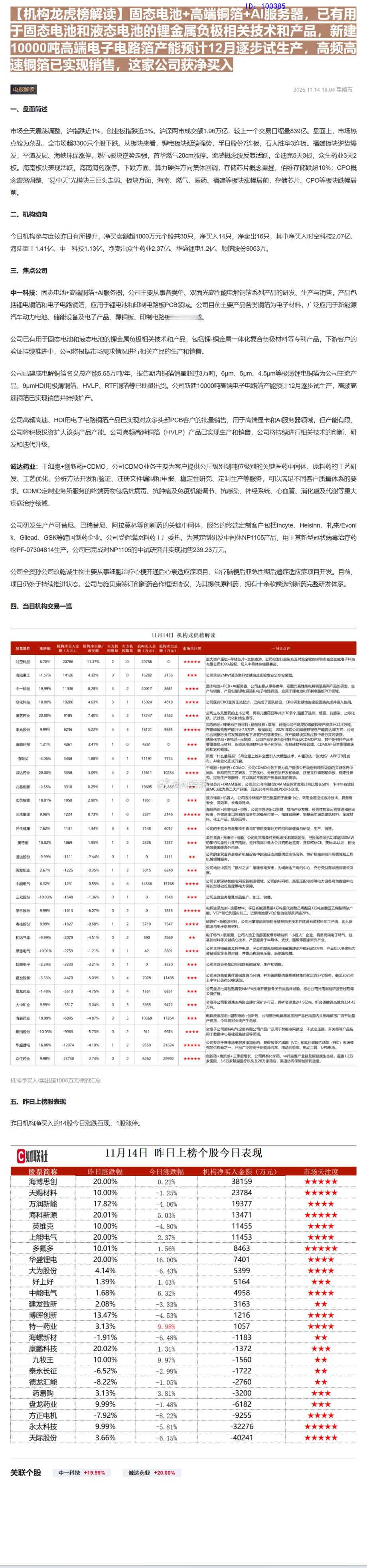 【机构龙虎榜解读】固态电池+高端铜酒物勞器,已有用于固态电池和液态电池的锂金属负极相关技术和产品,新建10000吨高端电子电路箔产能预计12月逐步试生产,高频高速铜箔已实现销售,这家公司获净买入