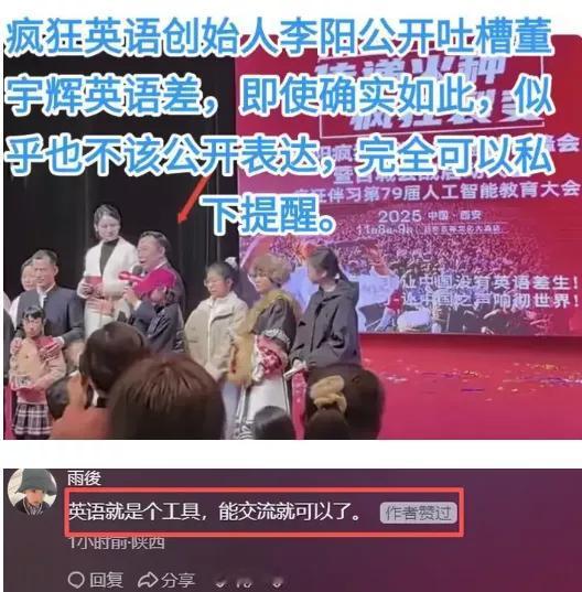 “疯狂的”李阳又开炮了!说董宇辉英语全是语法错误,发音像方言……可人家进博会上和老外聊唐诗,送《唐诗三百首》,外国嘉宾笑得合不拢嘴!这桥,到底是搭成了还是塌了? 说白了,李阳踩着董宇辉卖他4.8万的疯狂英语集训营,可网友不傻!你怼人时像考官,人家交流时是文化使者! 如今AI翻译秒懂十国语言,谁还死磕完美发音?语言学家早说了,全球英语,能沟通就是满分!董宇辉坦荡认错,李阳死咬标准,格局差了一个太平洋。 这世上,有人忙着挑刺,有人忙着搭桥。你说,哪个才是真本事?