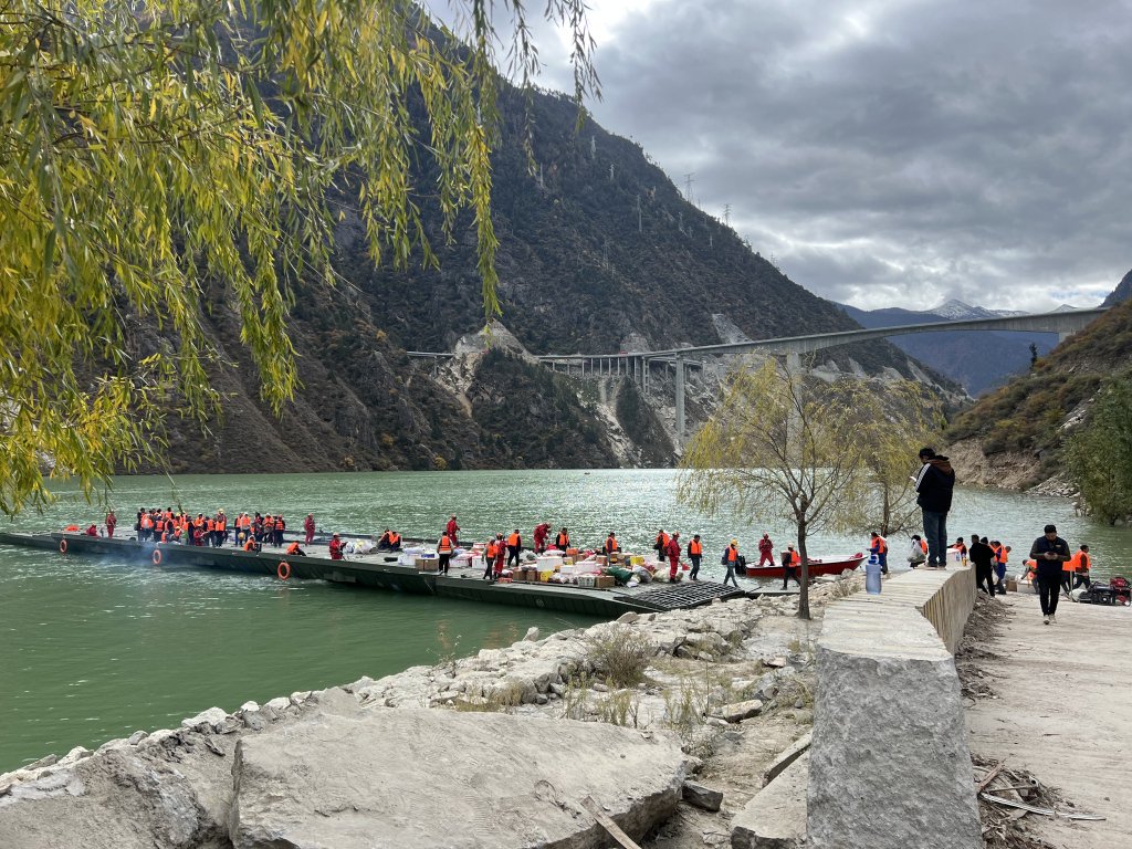 地灾发生后,英戈洛村及部分周边村的村民、水库施工人员被困在了大桥的另一边,他们通过水库清渣打捞船、冲锋舟等为村民运送必要的物资。