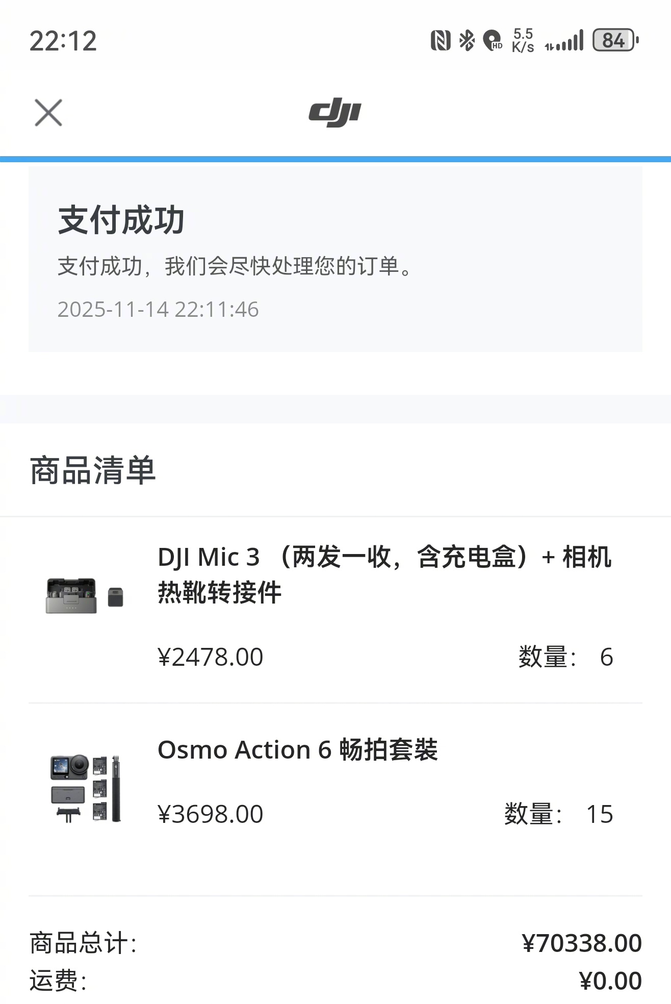 给公司买了一批新的大疆Action 6运动相机和MIC 3无线麦。咔一下,7万多没了
