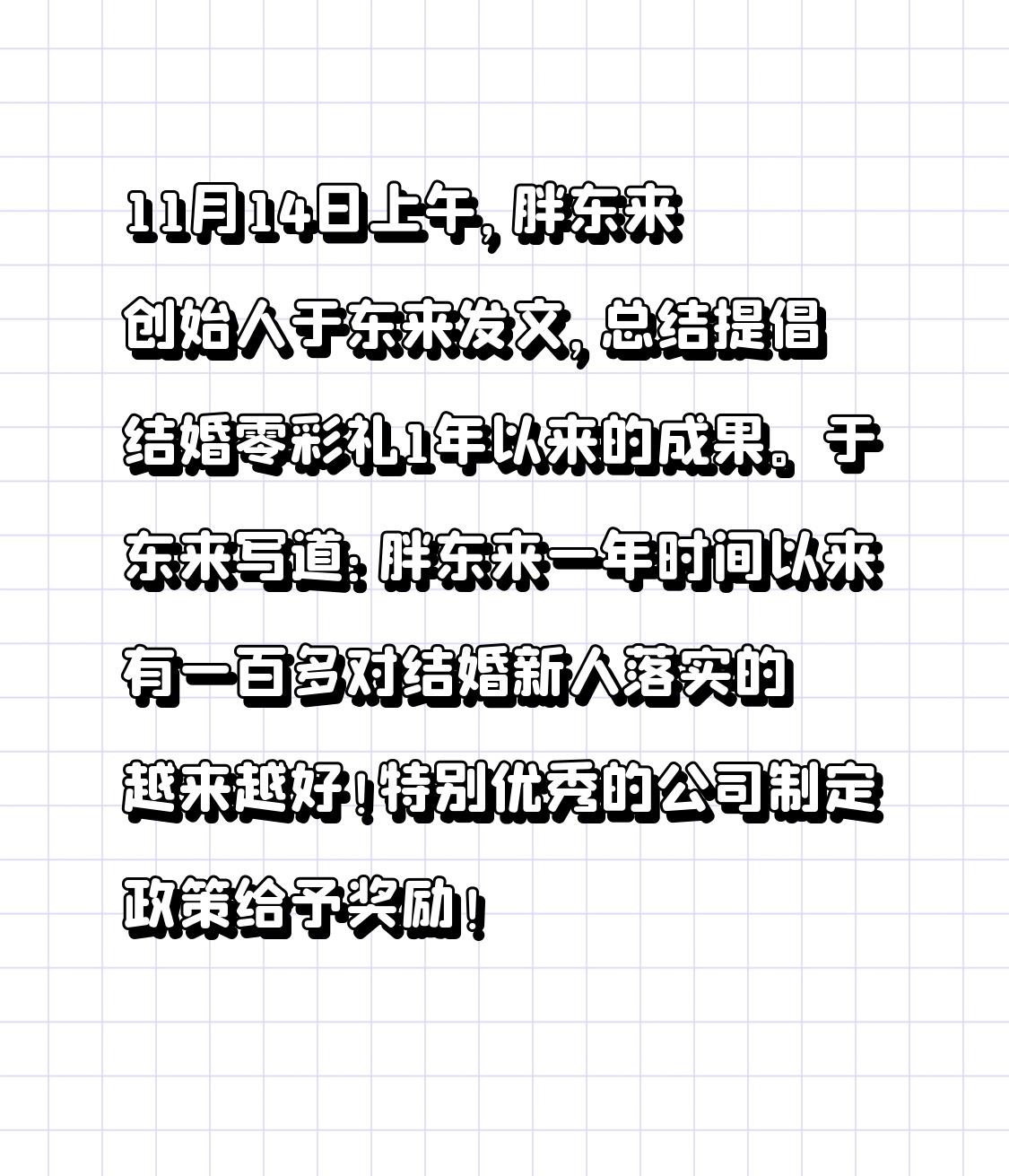 11月14日上午,胖东来创始人于东来发了篇文章,总结提倡结婚零彩礼这一年来的成果。于东来在文章里写道:这一年,胖东来有一百多对新人结婚,这零彩礼的事儿落实得那是芝麻开花节节高!表现特别优秀的公司还制定了政策给奖励呢,就像给努力奔跑的选手递上了一瓶“快乐汽水”!