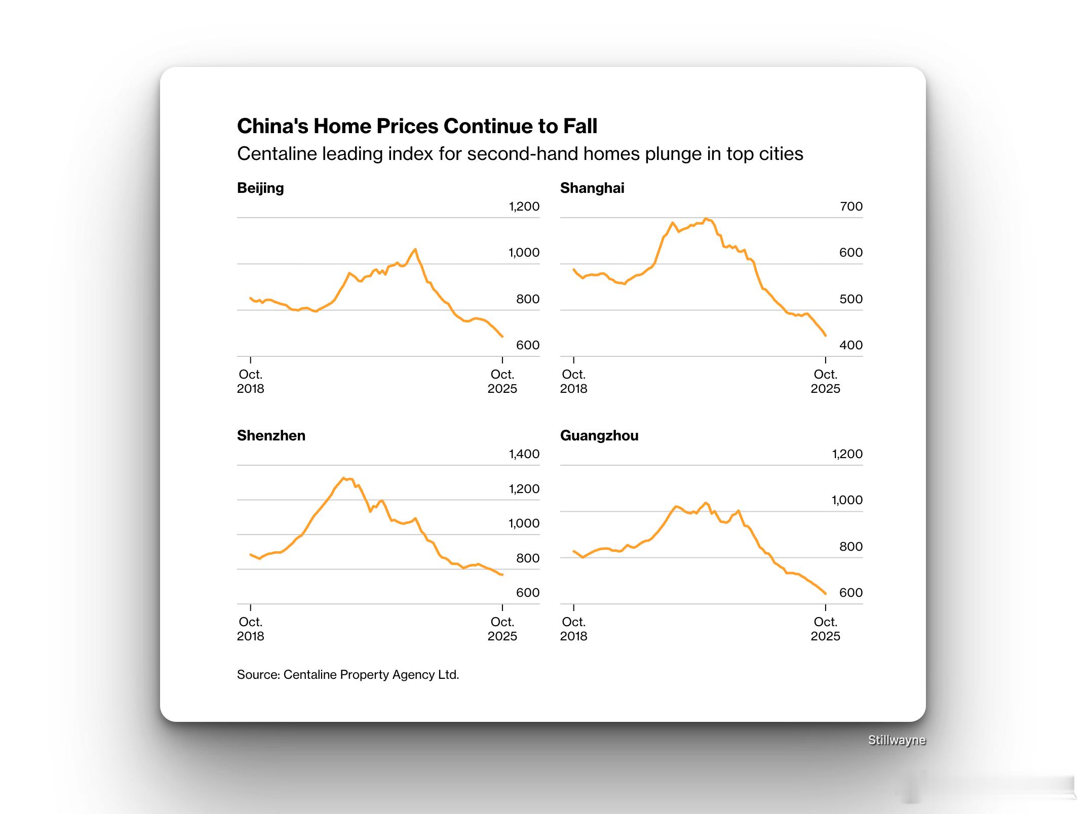 四个一线城市二手房领先指数走势。