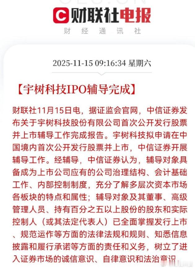 【】财联社11月15日电,据证监会官网,中信证券发布关于宇树科技股份有限公司首次公开发行股票并上市辅导工作完成报告。宇树科技拟申请在中国境内首次公开发行股票并上市,中信证券开展辅导工作。经辅导,中信证券认为,辅导对象具备成为上市公司应有的公司治理结构、会计基础工作、内部控制制度,充分了解多层次资本市场各板块的特点和属性;辅导对象及其董事、高级管理人员、持有百分之五以上股份的股东和实际控制人(或其法定代表人)已全面掌握发行上市、规范运作等方面的法律法规和规则、知悉信息披露和履行承诺等方面的责任和义务,树立了进入证券市场的诚信意识、自律意识和法治意识。