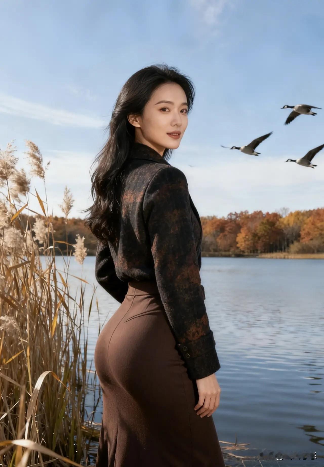 湖畔娴雅展笑靥,南归飞雁舞风姿。