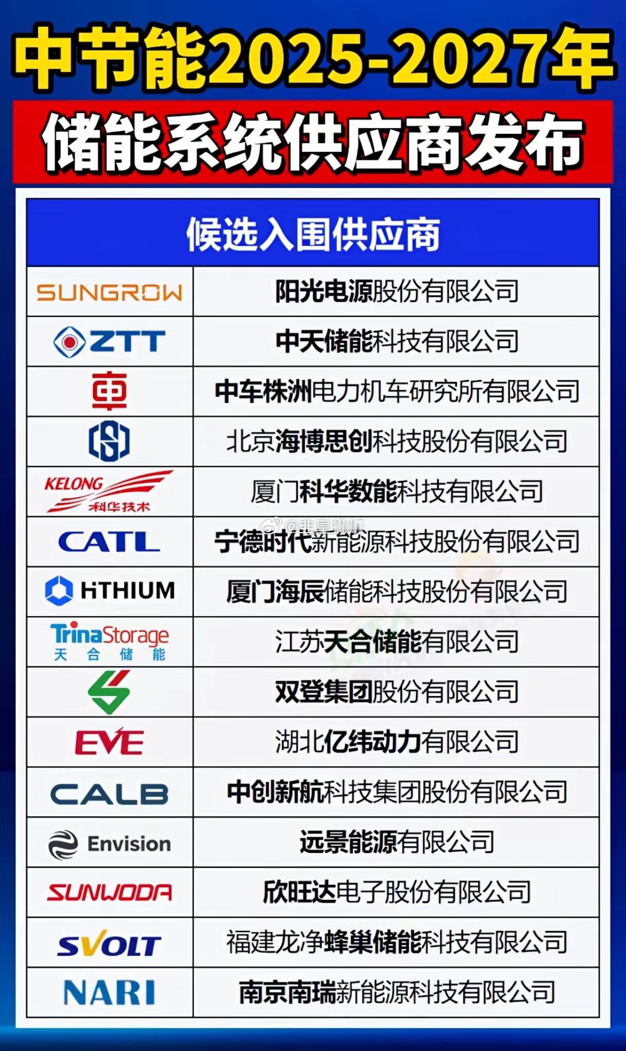 当“中节能2025-2027储能供应商名单”落下15家企业的名字,这场覆盖超2GWh的招标,实则是中国储能产业从“政策驱动”向“技术+市场双轮”跃迁的缩影。名单里,宁德时代与海辰储能的“技术角力”最具看点:前者以434Wh/L能量密度的587Ah电芯锚定高端光储项目,后者用10000次循环寿命的∞Cell方案抢占长时储能赛道,而阳光电源PowerTitan3.0的684Ah大电芯+99.3%效率液冷PCS,直接将1GWh场站占地压缩45%——这些参数背后,是中节能在甘肃、新疆等新能源基地“度电成本再降10%”的现实诉求。更值得关注的是“新面孔”:宁德时代与中节能2月签约的战略协同,让其从“电芯供应商”升级为“全链条伙伴”;远景能源的构网型储能技术,适配了中节能独立储能电站的电网调频需求。15家企业里9家首入名单,恰恰印证了行业逻辑的迭代:当136号文要求储能项目IRR不低于6%,“低价中标”已让位于“安全+寿命+收益”的综合博弈。这场招标的终点,是2027年1.8亿千瓦新型储能装机的国家目标——而这些企业的电芯、系统与算法,正在把“双碳”的宏大叙事,拆解成每一度绿电的精准存储与高效释放。