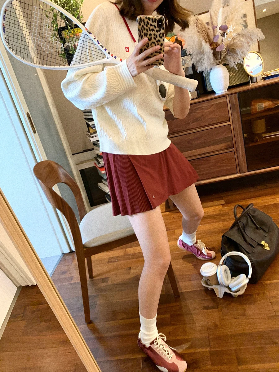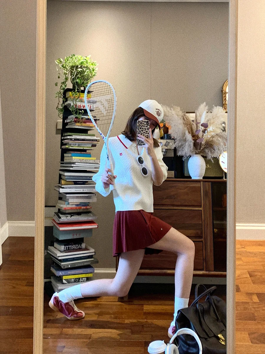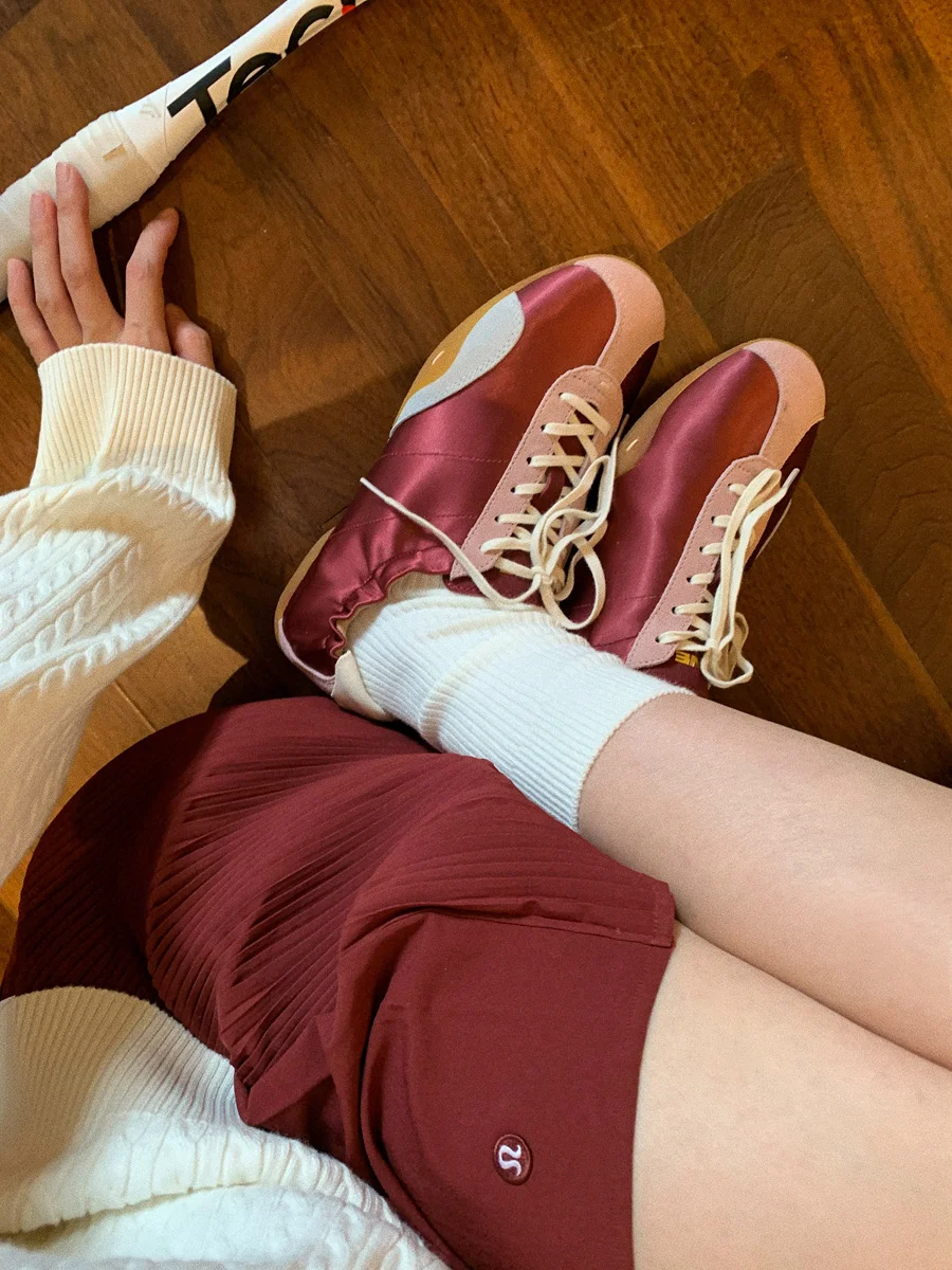 最近的快乐是壁球给的 一周三练 神清气爽! 一整身的Burgundy outfit🍷♥️ 色彩浓郁又复古 👟球鞋底真的很薄 很软! 缎面材质光线下的光泽太美了✨ -