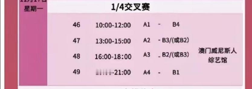 11月17日 10:00 女排1/4决赛 江苏Vs辽宁 全运会女排最后一轮还有四川Vs澳门、上海Vs香港两场比赛,将在19:00进行。 但胜负已经不影响A组、B组排名! A组 第一江苏 第二河南 第三天津 第四辽宁 B组 第一山东 第二福建 第三上海 第四辽宁 1/4决赛 江苏Vs辽宁 河南Vs上海 天津Vs福建 山东Vs北京 11月17日 10:00 江苏女排Vs辽宁女排