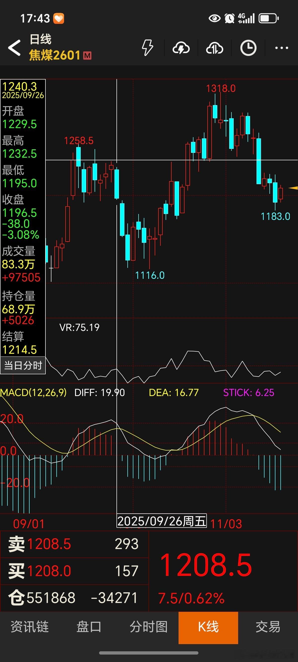 来说一下焦煤!好像很多人认为转空了就要一直跌,这是什么道理?焦煤仅仅是反弹而已。要想转多,焦煤必须得到1240所以继续我的策略,焦煤目前依然处于空头趋势中!还有,不要说是我说的空头趋势就要顺利转空,谁也保证不了行情能一直按照策略运行!我之前提示的豆粕菜粕,纸浆顺利转多了,但是焦煤能不能顺利转空,就要看1240,只要反弹不上破,那空头就会继续!做交易永远都要把容错率加入到策略里,我不是神,如果我说的所有的方向都能按照我的方向去运行,那我就是神了!所以,做交易是理性的,并且也是概率的,这是很正常的!