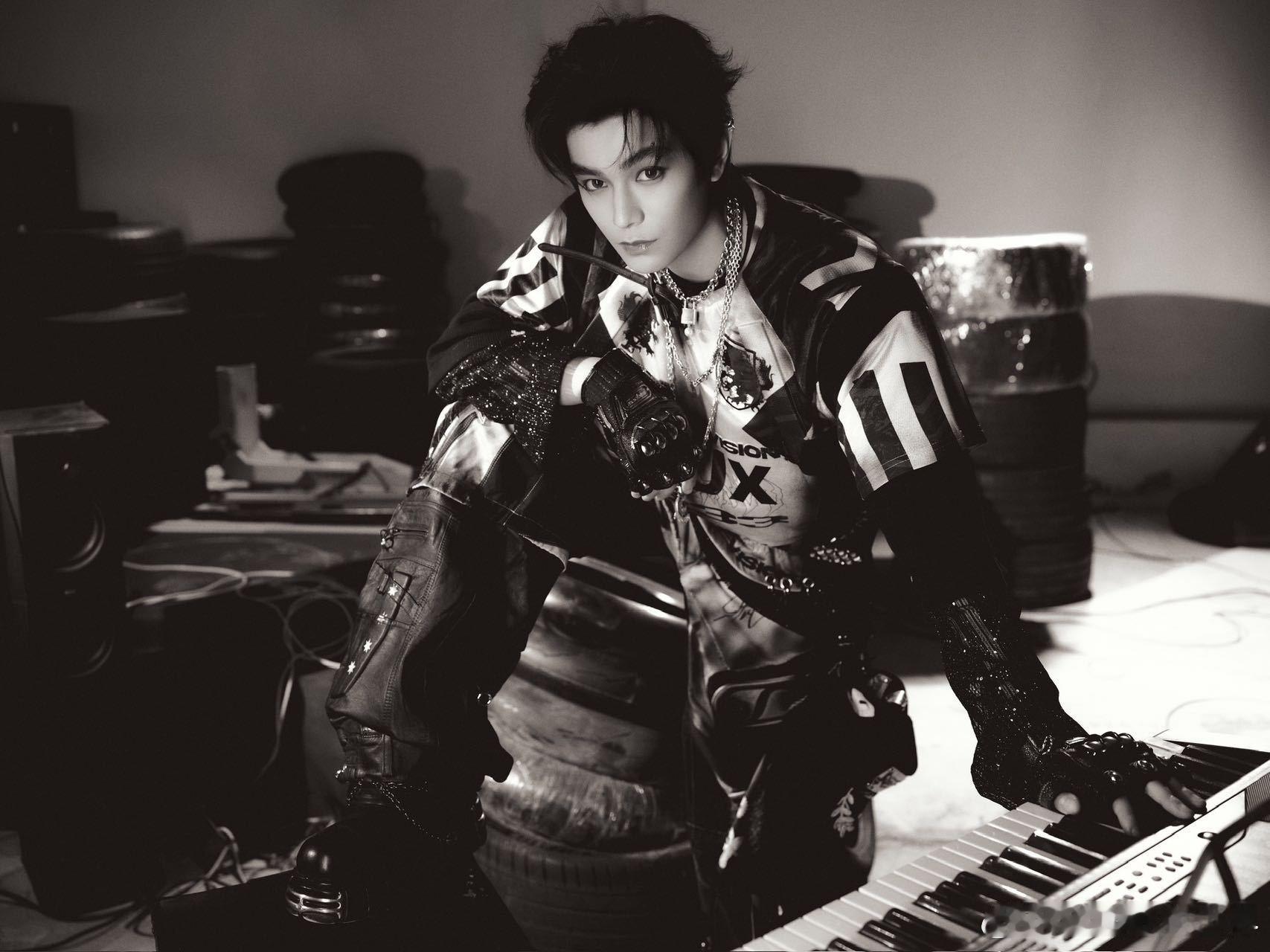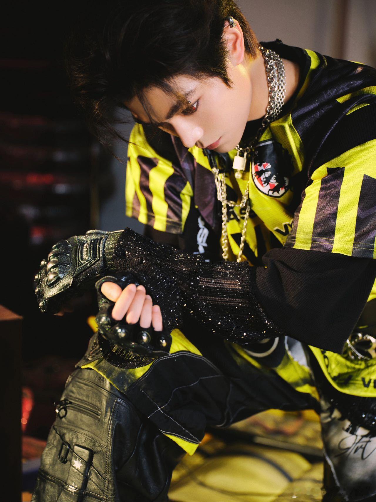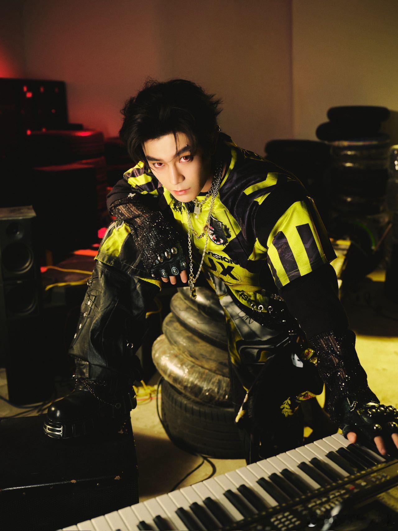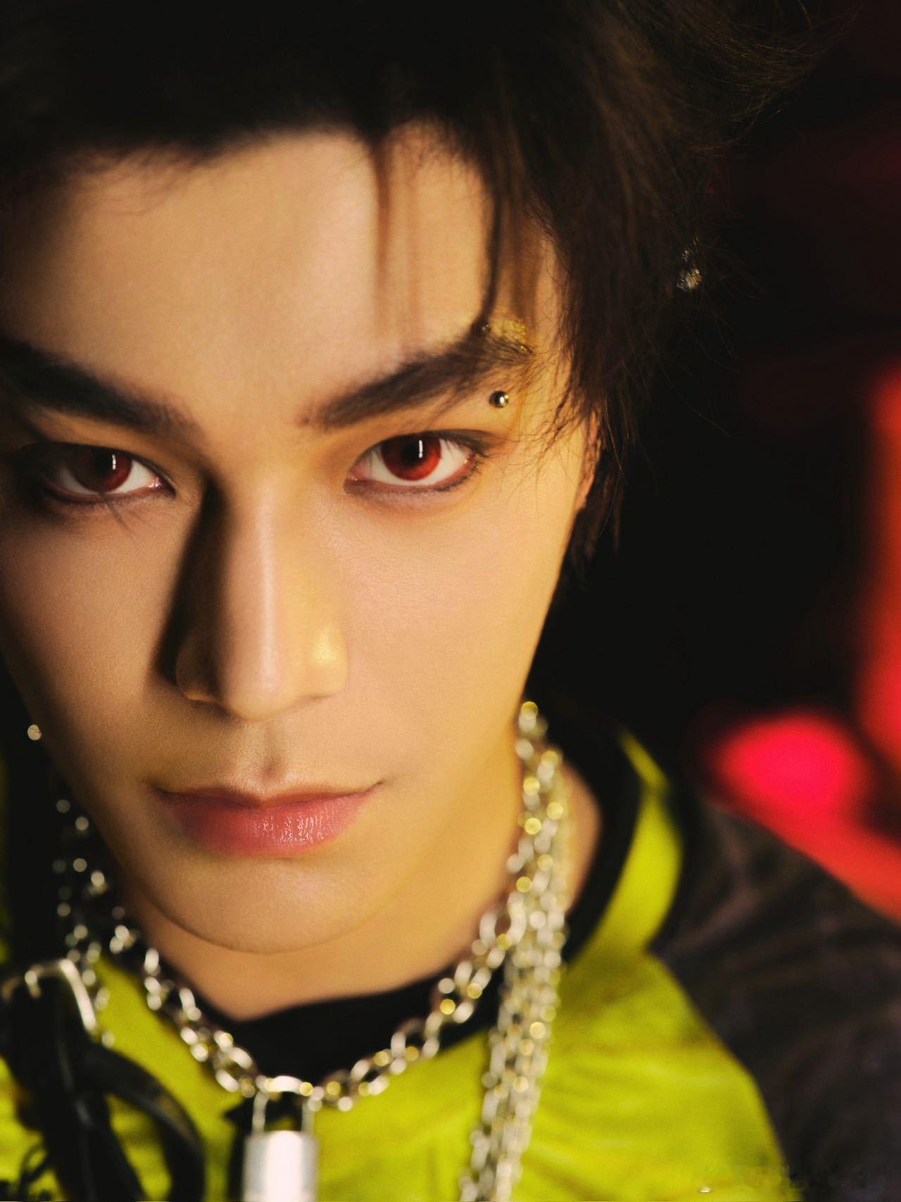 音乐节造型一亮相,直接惊艳四座!色彩T恤和烫钻透视内搭的组合,时尚又个性,露指手套带着酷酷的范儿,眉骨钉妆容搭配红瞳,仿佛是来自梦幻世界的完美男神,太让人心动了!