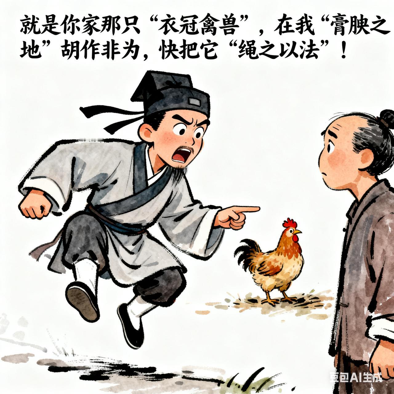 古代笑话 一日书生见邻居家的鸡跑到自家菜地, 急忙喊:“有匪鸡兮,侵我畎亩! 速速缚之,以儆效尤!” 邻居听半天没懂, 反问:“你说啥? 我家鸡咋了?” 书生急得跳脚: “就是你家那只‘衣冠禽兽’, 在我‘膏腴之地’胡作非为, 快把它‘绳之以法’!” 邻居不耐烦了, 抓起鸡就走: “不就是啄了你几棵菜吗? 整这些文绉绉的, 我还以为你要跟鸡对诗呢!”