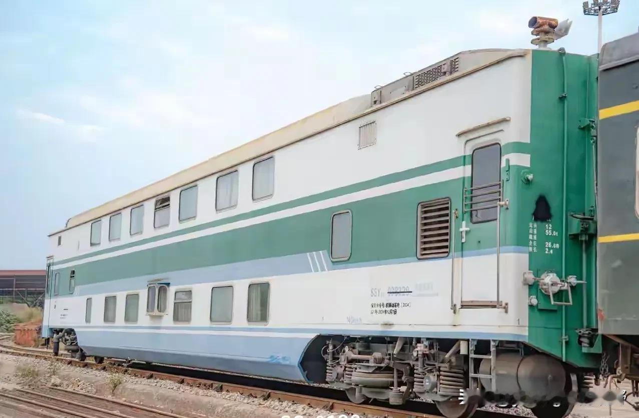 深圳的一处铁路停车场内,停放着曾经的进港直通车25Z软座车底和双层检测车车底。这