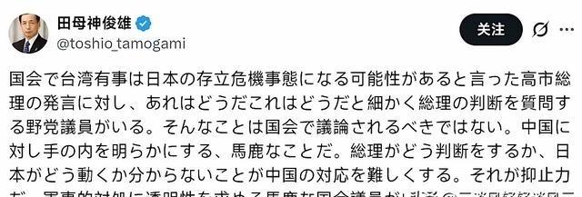 曾任日本空军参谋长的田母神俊雄在自媒体上评论说:“对于高市首相在国会上表示台湾发