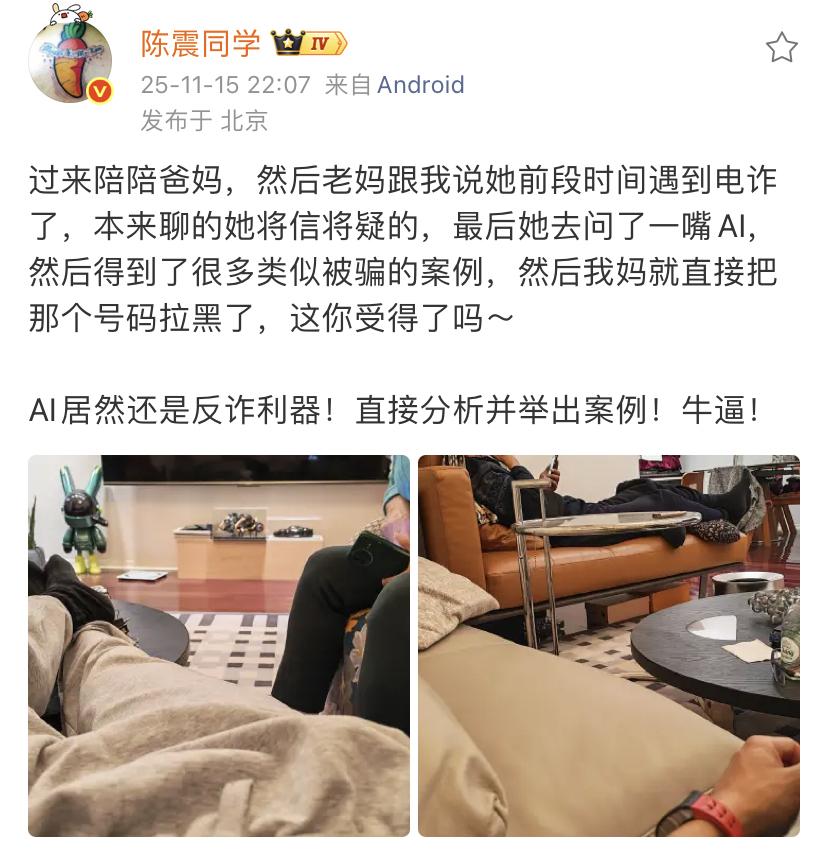 陈震:过来陪陪爸妈,然后老妈跟我说她前段时间遇到电诈了,本来聊的她将信将疑的,最后她去问了一嘴AI,然后得到了很多类似被骗的案例,然后我妈就直接把那个号码拉黑了,这你受得了吗~ 唯一的好办法就是尽量不接任何太陌生的电话,现在电诈真的是防不胜防,应该有很多年轻人现在已经不接任何电话了吧,除非确认这个变化是安全的。 有时候真的是防不胜防,还有各种推销的电话也是防不胜防的状态。各位是怎么看的?欢迎评论区留言。