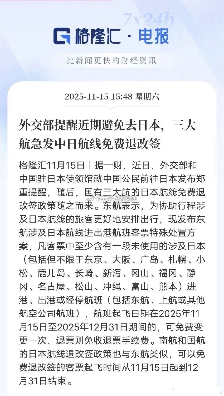 安全优先!外交部提醒+航司免费退改,赴日游该按下暂停键11月14日外交部郑重提醒,因日本针对中国公民的违法犯罪多发、多起遇袭案件未侦破,且日方涉台挑衅恶化交流氛围,近期请避免赴日 。15日国航、南航、东航迅速跟进,推出11月15日至12月31日日本航线免费退改政策,覆盖东京、大阪等多地航班。旅游的前提是人身安全,当目的地安全风险攀升,暂缓出行绝非冲动选择,而是对自己和家人负责。航司的兜底举措更让理性决策无顾虑,出境游可选替代目的地,何必冒着风险远行?