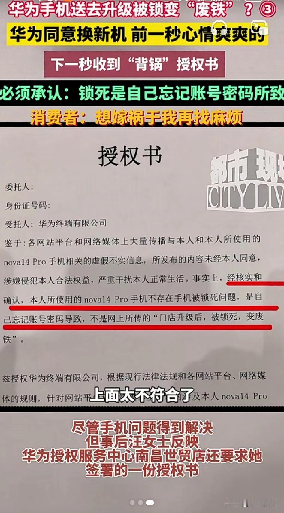 华为手机送去升级被锁变“废铁”? 同意换新机后大姐开心表示感谢媒体:“ 前一秒心情爽爽的,下一秒收到“背锅”授权书。必须承认:锁死是自己忘记账号密码所致。 大姐担心签字后:想嫁祸于我再找麻烦!现在想哭。 因为这事大姐找了记者帮忙,随后记者就去店里问问题,你们为什么这么处理呢?工作人员回应现在我没法回答你这个问题![捂脸] 有点像丢了西瓜捡芝麻!