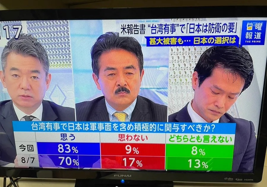 日媒民调数据:83%的日本人支持日本武力介入台海局势!日本电视台一政论节目民调数据显示,83%的受访者日本人支持“日本武力介入台海”、只有9%反对、另外8%表示无所谓。就问这个数据,还有人对日本抱有幻想吗?我想说,若是日本真的武力介入台海,估计100%的中国人都支持顺便扬了日本……