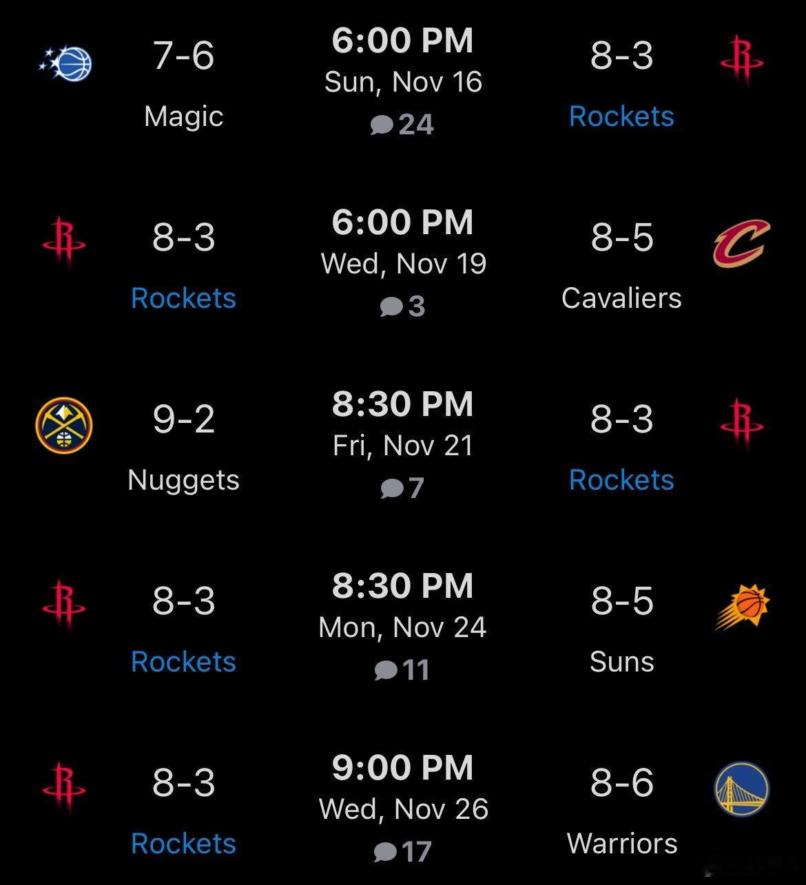 强度开始来了, 火箭(8胜3负)接下来5场赛程:11月17日:魔术队(7胜6负)11月20日:客战骑士队(8胜5负)11月22日:掘金队(9胜2负)-NBA杯赛11月25日:客战太阳队(8胜5负)11月27日:客战勇士队(8胜6负)-NBA杯赛~预测一波战绩? (班凯罗将会缺席明天的比赛)