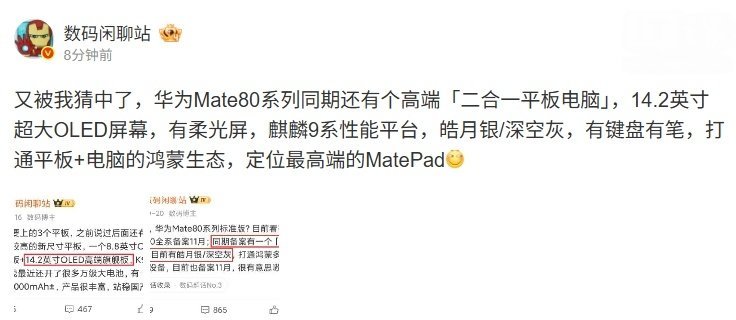 【消息称华为 Mate 80 系列同期还有高端“二合一平板电脑”,麒麟 9 系性能平台】博主 数码闲聊站爆料称,华为 Mate80 系列同期还有个高端「二合一平板电脑」,14.2 英寸超大 OLED 屏幕,有柔光屏,麒麟 9 系性能平台,皓月银 / 深空灰,有键盘有笔,打通平板 + 电脑的鸿蒙生态,定位最高端的 MatePad。目前,官方暂未公布以上新品的具体发布时间。总台大型直播晚会《鸿蒙星光盛典》将于 11 月 28 日在深圳龙岗大运体育中心启幕,央视频、央视财经频道(CCTV-2)、央视新闻、央视财经同步直播。该博主曾爆料某年度旗舰新机的部分规格,预计为华为 Mate 80 系列。据爆料,该机的标准版和 Pro 版均搭载 6.75 英寸 1.5K 屏幕,“大大杯”开始切更大尺寸的 6.89 英寸 1.5K,屏幕用料规格更好,影像提升了一个等级,之前说的 50Mp 双长焦方案顺利落地了,网传会直接叫 Pro Max。