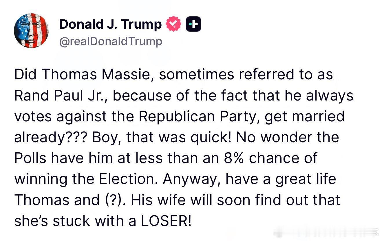 【黄金时代】川普对共和党反川普议员马西,在前妻死后,马上和神秘人物闪电结婚,欲言又止:托马斯·马西(有时被称为“小兰德·保罗”——因为他总是投票反对共和党)已经结婚了吗???天哪,这也太快了吧!难怪民调显示他赢得选举的机会不到 8%。不管怎样,祝托马斯和(?)生活愉快。他的妻子很快就会发现:她嫁了一个失败者