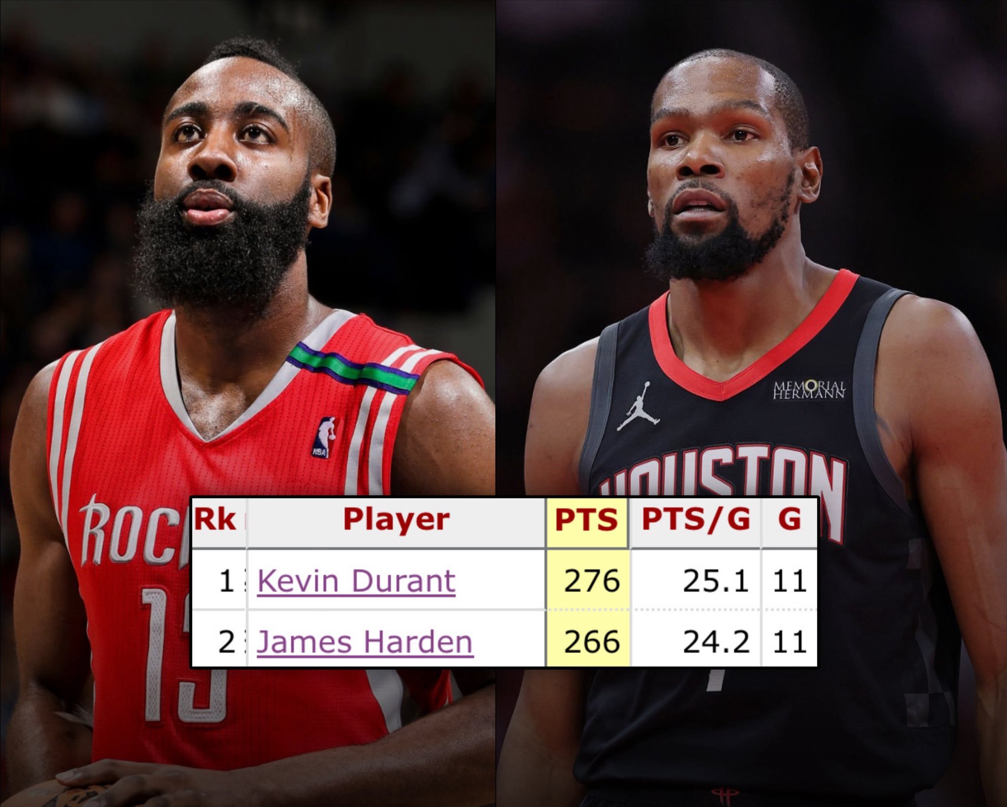 杜兰特火箭生涯前11战合砍276分 超越哈登 队史第一