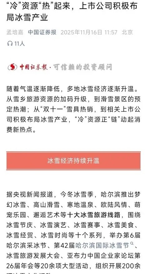 冰雪经济概念股梳理分析!今冬冰雪经济的爆发式升温:哈尔滨推出十大冰雪旅游线路、20余项大型活动,冰雪大世界扩建至120万平方米;美团数据显示滑雪场搜索量涨近900%,“双十一”滑雪装备成交额增超10倍;政策层面冰雪经济规模2025年将破万亿,上市公司围绕旅游、装备、基建等领域布局,成为冬季消费核心热点。冰雪经济受益股梳理1. 长白山:东北冰雪旅游核心标的,主营长白山景区旅游客运、服务,冬季覆盖冰雪观光、滑雪项目,控股股东关联和平滑雪场。今冬景区“滑雪+温泉”产品带动客流,旅游客运直接受益,是板块最直接的标的之一。2. 探路者:户外装备龙头,产品含滑雪服、滑雪板等冰雪装备,“双十一”雪具销量高增,同时布局冰雪赛事与雪场施工。今冬冰雪经济升温带动装备销售、赛事运营双业务,是冰雪装备+赛事的核心标的。3. 中粮工科:冰雪场馆基建技术龙头,参与北京冬奥会“冰丝带”、哈尔滨冰雪大世界的制冰/造雪系统设计,技术覆盖二氧化碳跨临界制冰。今冬冰雪景区扩建潮下,其冰雪工程订单有望放量,是冰雪基建领域的核心标的。4. 雪人股份:哈尔滨冰雪大世界核心制冰设备供应商,主营制冰系统、低温压缩机,支撑冰雕存冰、智能温控。今冬冰雪场馆扩建带动设备需求,同时布局氢能,“冰雪装备+氢能”双逻辑,是冰雪设备领域龙头。5. 宋城演艺:文旅演艺龙头,在东北布局冰雪主题沉浸式演艺,结合当地冰雪资源打造场景化演出。今冬冰雪旅游升温带动景区配套消费,演艺项目作为增值服务,客流增长直接提升营收,是“文旅+冰雪”联动标的。6. 三夫户外:户外用品零售商,线下门店覆盖滑雪热门区域,主营滑雪装备、服饰,“双十一”雪具销量同比高增。今冬冰雪消费热潮下,终端零售业务直接受益,同时布局户外赛事,是冰雪装备零售端标的。7. 锦江酒店:中高端酒店龙头,在哈尔滨、长春等冰雪城市密集布局。美团数据显示滑雪场附近酒店搜索量大涨,今冬冰雪客流带动入住率、房价双升,是冰雪旅游配套酒店的核心标的。8. 首旅酒店:覆盖多档次酒店,在东北冰雪城市布局充足房源。今冬冰雪旅游预订热度高,酒店业务迎客流高峰,入住率提升直接带动营收,是冰雪配套酒店的重点标的。9. 中体产业:冰雪赛事运营龙头,承办吉林国际滑雪赛事,整合场馆、旅游资源推“赛事+旅游+装备”模式。今冬冰雪赛事增多,带动赛事运营、品牌招商,是冰雪赛事领域核心标的。10. 中青旅:综合旅游服务商,推出东北冰雪旅游线路,今冬预订量同比高增。旅游产品营收随客流提升,同时运营乌镇等景区,是“综合旅游+冰雪”的联动受益标的。11. 冰山冷热:主营制冷设备,应用于冰雪场馆制冷系统,参与多地滑雪场基建。今冬冰雪场馆扩建、升级需求下,其制冷设备订单有望增加,是冰雪设备领域的细分受益标的。12. 大连圣亚:海洋主题乐园运营商,冬季推“冰雪+海洋”主题活动,获同程注资整合“机票+门票”流量。今冬冰雪旅游升温带动乐园客流,主题活动提升消费意愿,是区域“文旅+冰雪”标的。13. 凯撒旅业:旅游服务商,主打东北冰雪度假套餐,今冬预订量高增。旅游业务直接受益于冰雪消费潮,是冰雪旅游产品端的受益标的。14. 际华集团:军工背景户外服饰企业,产品含防寒滑雪服,今冬冰雪经济升温带动滑雪服饰终端需求。同时布局线下零售渠道,是冰雪服饰领域的受益标的。15. 众信旅游:旅游服务商,聚焦东北冰雪旅游线路开发,覆盖高端滑雪度假、民俗体验。今冬冰雪旅游预订量高增,旅游产品营收提升,是冰雪旅游零售端标的。16. 华体科技:体育场馆设施龙头,参与冰雪场馆设施建设、智能化改造,覆盖场地设备升级。今冬冰雪场馆扩建潮下,设施订单有望增长,是冰雪场馆配套标的。17. 晶雪节能:冰雪场馆保温材料标的,产品应用于万达茂滑雪场等项目的保温层。今冬冰雪场馆扩建带动保温材料需求,是冰雪基建上游标的。18. 龙建股份:东北基建国企,承建亚冬会保障线路、亚雪公路等冰雪旅游基建项目,同时引入冰上龙舟等冰雪活动。今冬冰雪旅游基建需求下,工程订单有望增加,是冰雪基建标的。19. 欧亚集团:吉林零售龙头,商业综合体绑定冰雪旅游客流,冬季推出冰雪主题促销。今冬冰雪游客带动商超、百货消费,是冰雪旅游配套零售标的。20. 武商集团:武汉商业龙头,布局室内滑雪场,结合商业体打造“滑雪+消费”场景。今冬室内冰雪消费升温,滑雪场带动商业客流,是“商业+冰雪”标的。总结这些受益股覆盖冰雪旅游、装备、基建、配套等全产业链,核心逻辑分两类:一是直接受益于冰雪旅游客流的标的;二是受益于产业基建、装备需求的标的。板块受季节周期影响较大,需关注客流持续性与订单落地情况,同时区分短期情绪标的与长期基本面标的。本文涉及资讯、数据等内容来自网络公共信息,仅供参考,不构成投资建议!