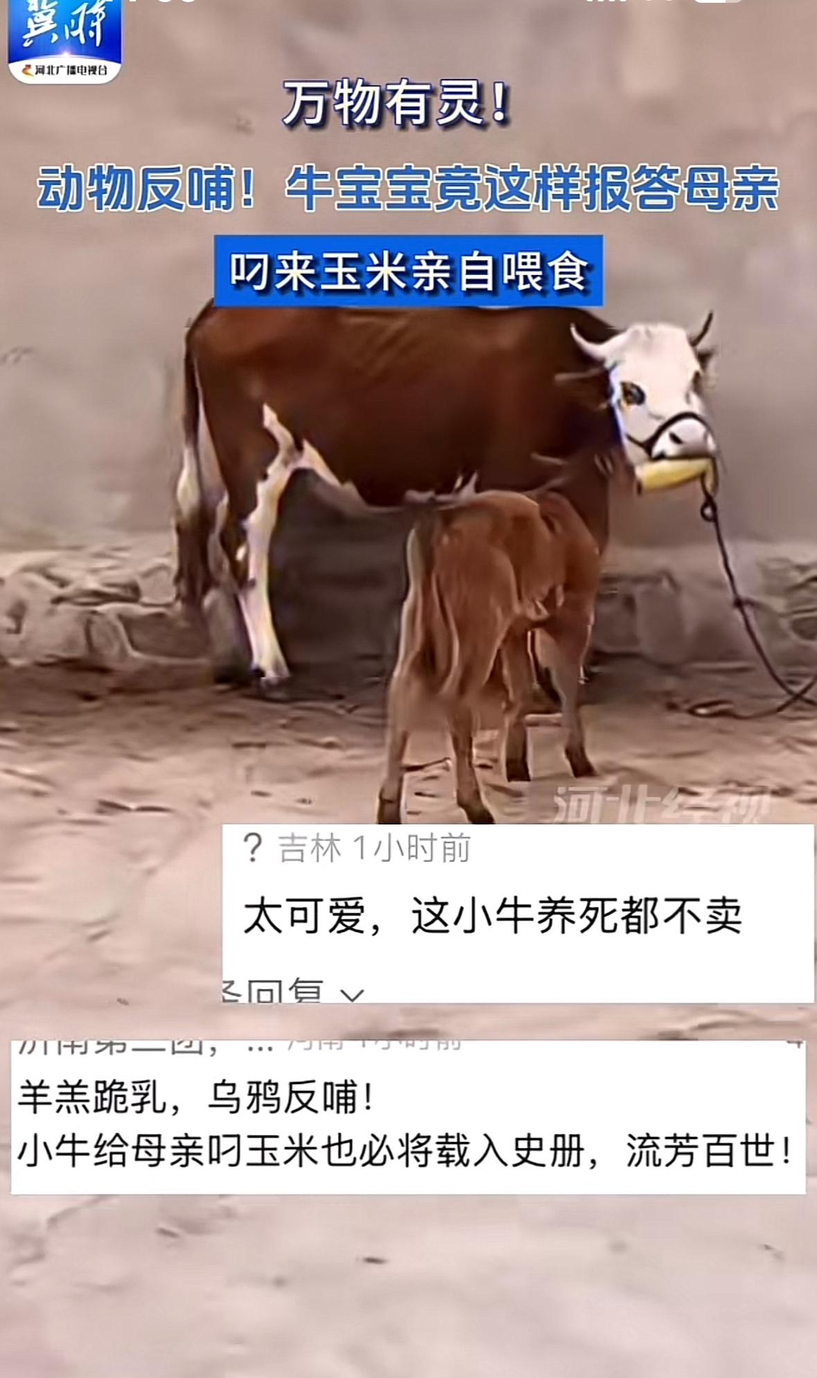 动物反哺!牛宝宝竟这样报答母亲。刚出生几个月的小牛犊跑过去把玉米棒子叼起来喂给妈妈吃。这一幕看得人好感动。 有网友说小牛像懂事孩子,还有人直言小牛比有些人强。确实,万物皆有灵,羊羔跪乳、乌鸦反哺,动物都懂感恩。 但我觉得,人之所以为人,除了懂得感恩,更该将这份情感升华。动物的感恩出于本能,而人应靠的是内心的道德与修养。我们不能只停留在与动物对比,更要思考如何将感恩化作日常行动,给父母更好的陪伴与照顾。养小牛犊