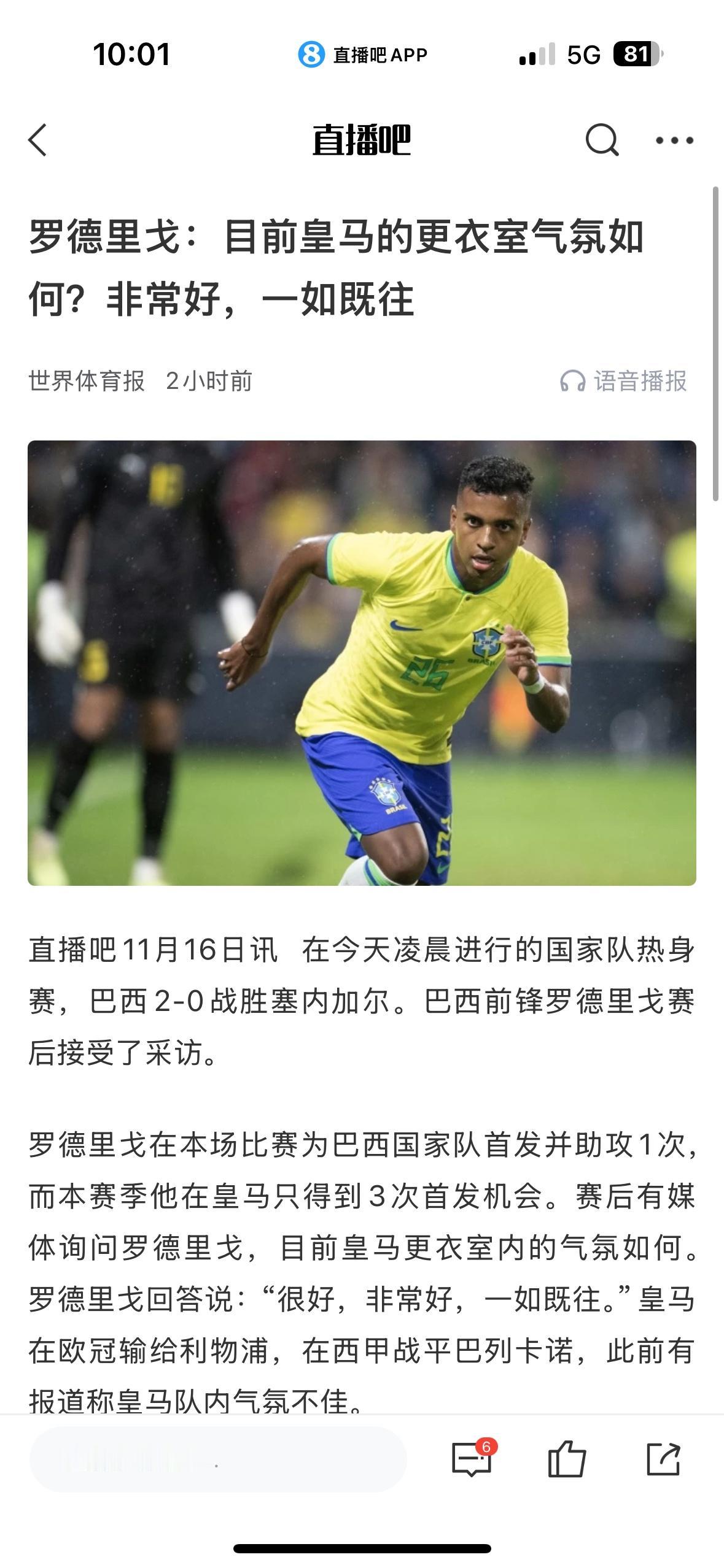 非常佩服皇家马德里,任何球员都能压得住。 罗德里戈在皇马都上不了场,他不敢抱怨,还说更衣室气氛很好。 他要是在曼联,在尤文图斯早就爆炸了。 至今没有球星离开皇马大放厥词,哪怕是被皇马抛弃的功勋,C罗,拉莫斯都不敢。 所以人家才是世界第一俱乐部,再有脾气都得憋住,皇马厉害呀。[可怜]