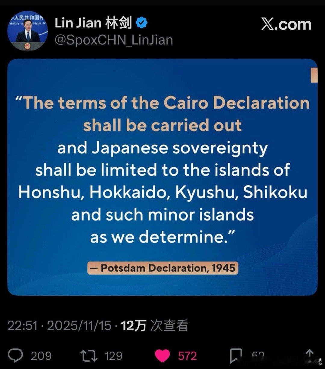 中国外交部发言人林剑在X贴了《波茨坦公告》的节选“开罗宣言之条件必将实施,而日本之主权必将限于本州、北海道、九州、四国及吾人所决定其可以领有之小岛在内。”
