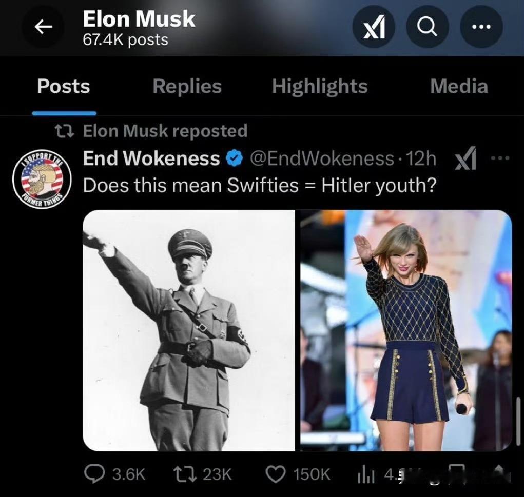 马斯克在社交平台点赞了一条关于霉霉Taylor Swift的帖子…[翻白眼][裂开]