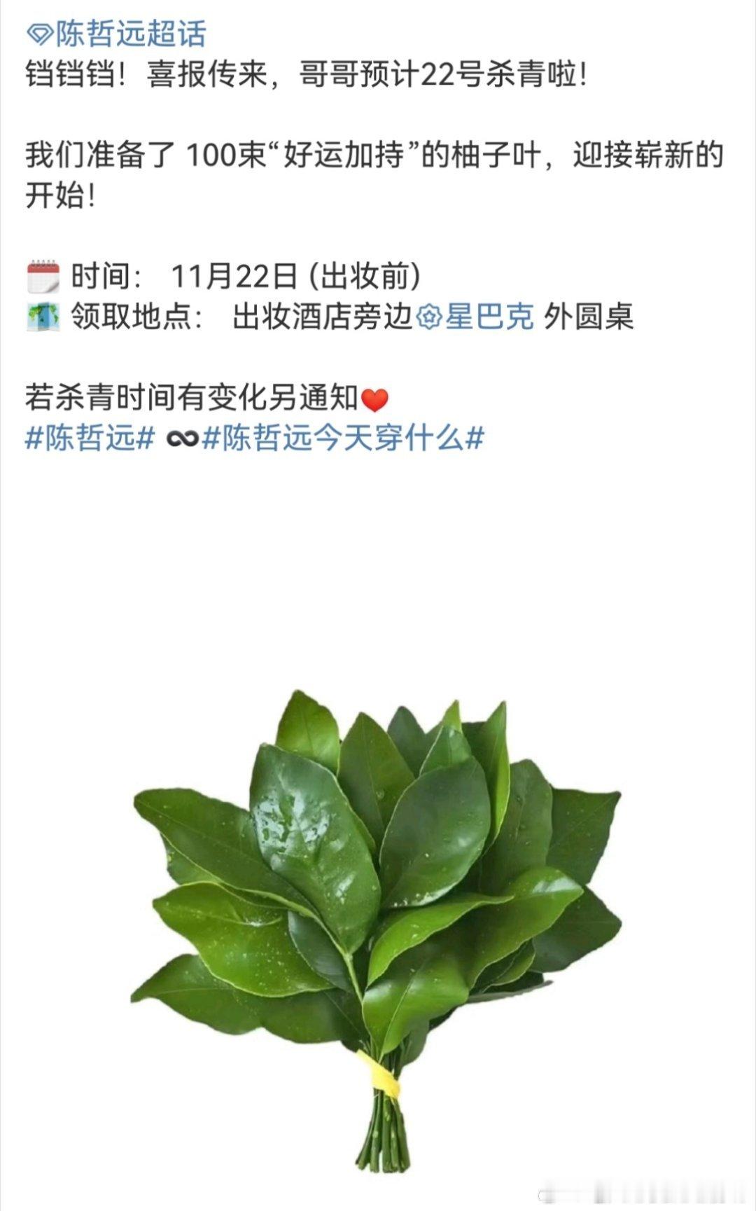 陈哲远粉丝为《江山为聘》的杀青准备了100把柚子叶加持好运,迎接崭新的开始