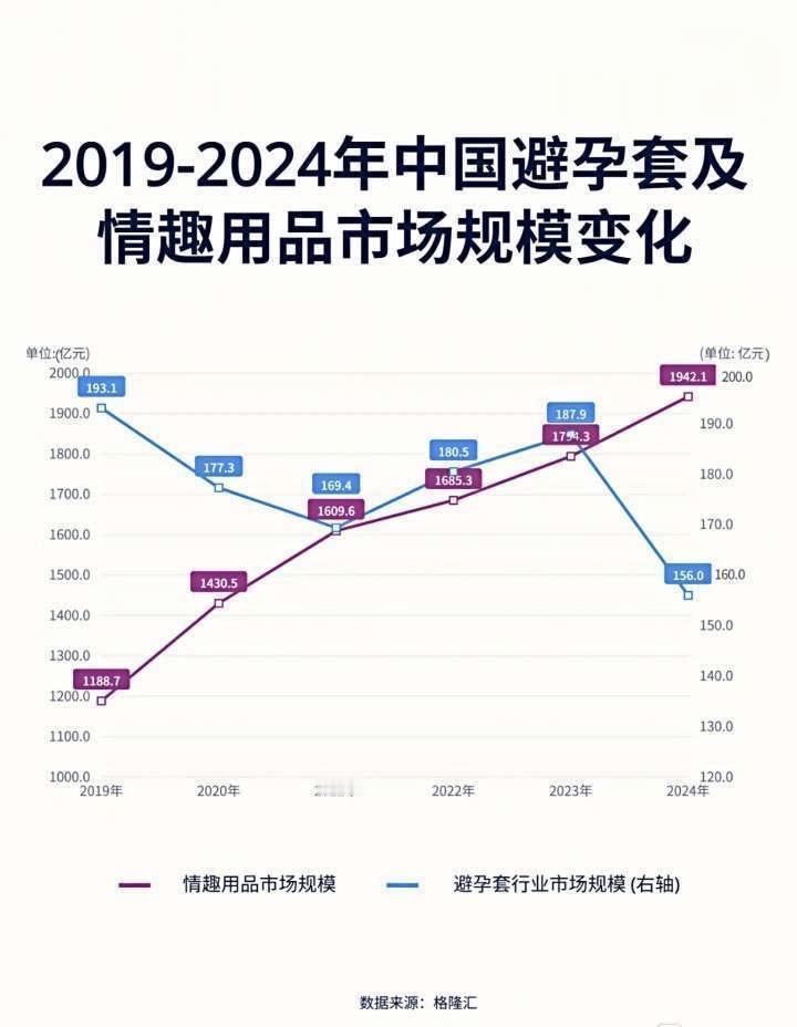 据格隆汇整理的数据,2024年,中国避孕套行业市场规模156亿元,同比下降17%,较2019年下降19.2%。 同期,中国情趣用品市场销售额达到1942.1亿元,同比增长8%,较2019年增长63.4%。 十几年前的情歌还唱“爱到不能自已”, 现在的情感博主却都说“爱人先爱己”。 身体力行的年轻人正在验证, sex生活,可能不需要两个人了。