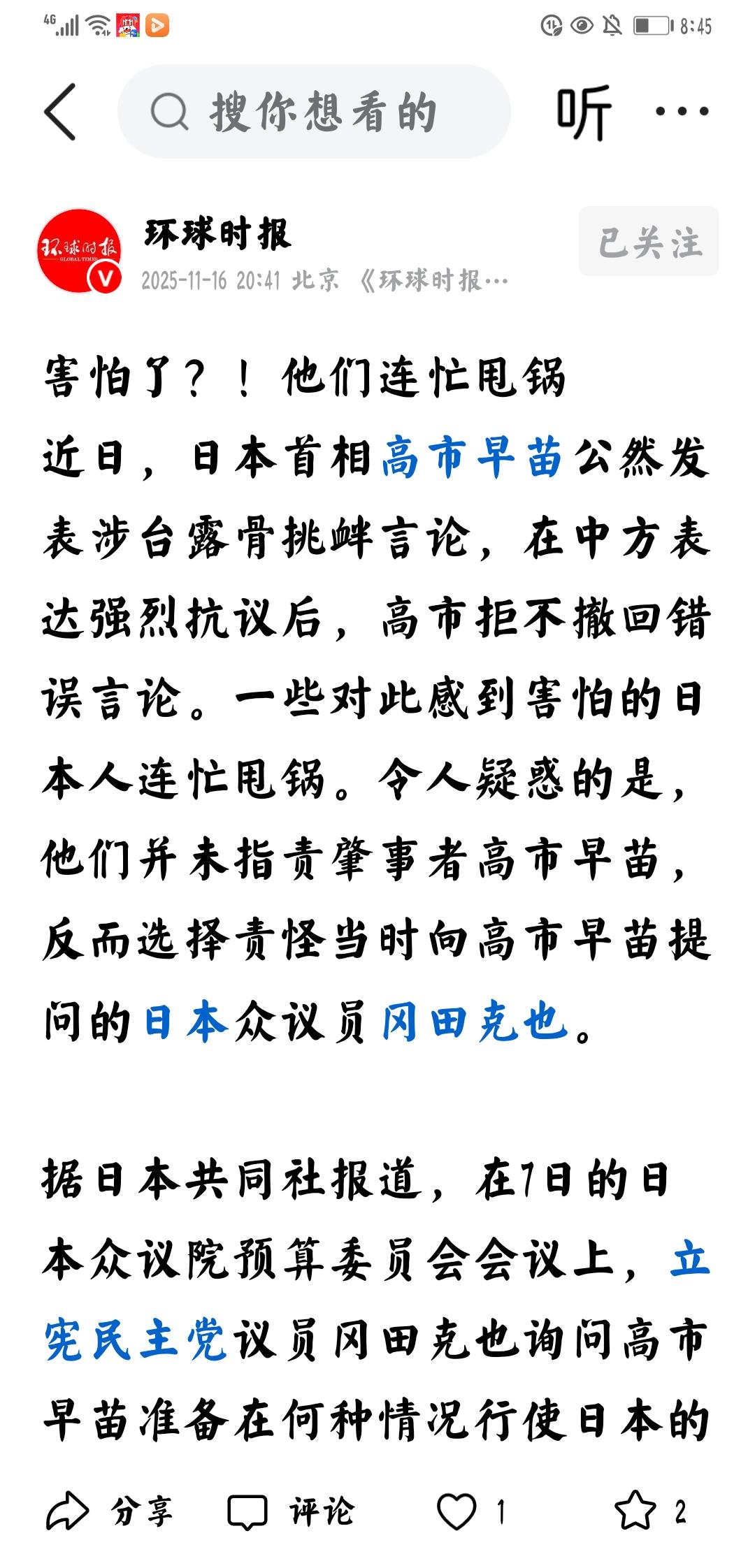 日本国内:热锅上的蚂蚁 个人观点:日本政坛出现“狗咬狗”。 无论日本做出何种态度:是强硬到底?还是蓄意挑拨?或者是避重就轻?或者是胡搅蛮缠?全都通通无关紧要,为时已晚。 趁此良机,台湾回归祖国,同时,如果日本干涉中国内政,那就一举多得,解决了两个夙愿。 套用万千网友的心声,“一言为定,高市早苗不要辜负中国万千网友的希望。”
