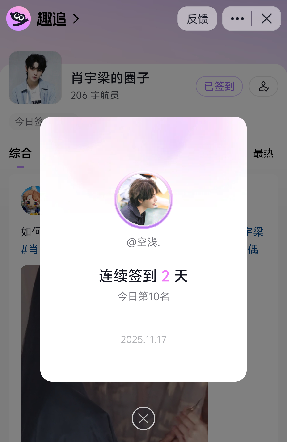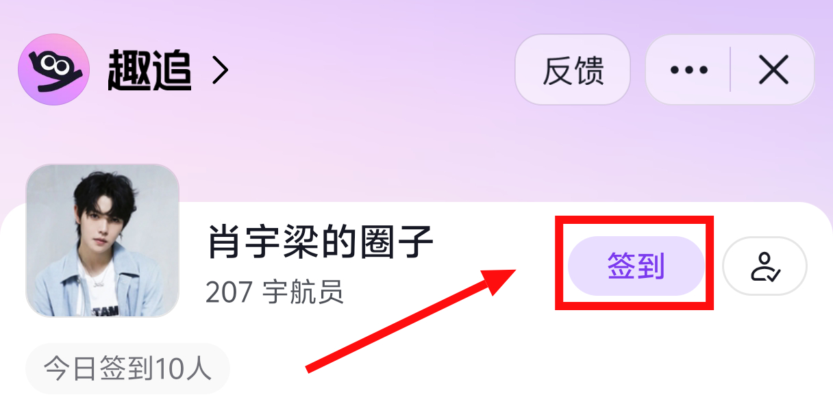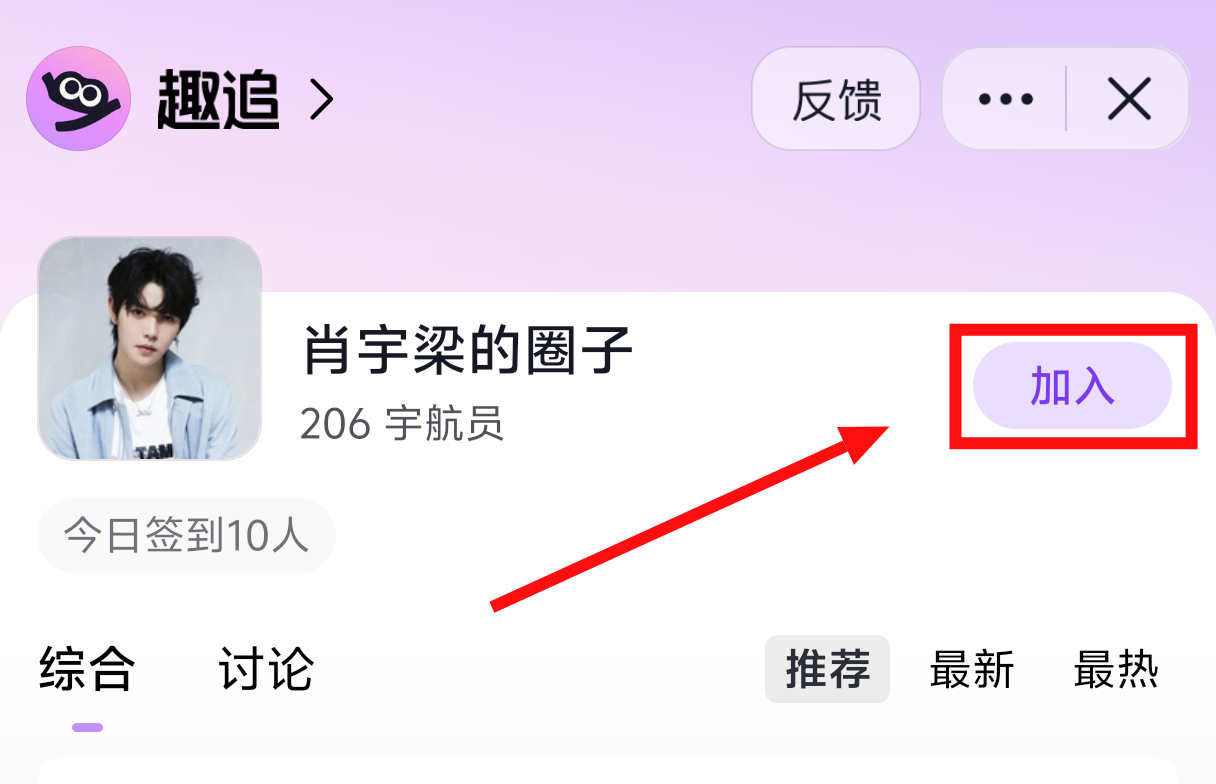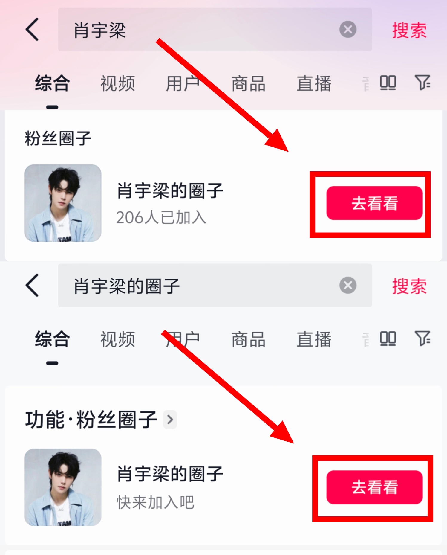 📣抖音 「粉丝圈子」功能上线了, 宇航员们速来加入,记得更新至最新版本哦1️⃣搜【肖宇梁】或【肖宇梁圈子】 图12️⃣点【去看看】图22️⃣点击加入图33️⃣点击签到图4昨天已经让抖群那边进了一部分了,目前200+,咱们大家看见这条都去加入并扩散一下哇这个是所有带肖宇梁tag的作品都会出现在圈子里,是抖开设的类似超话的小程序,大家每天记得到圈子签到和讨论哦,也可以经常在圈子里发/布视频