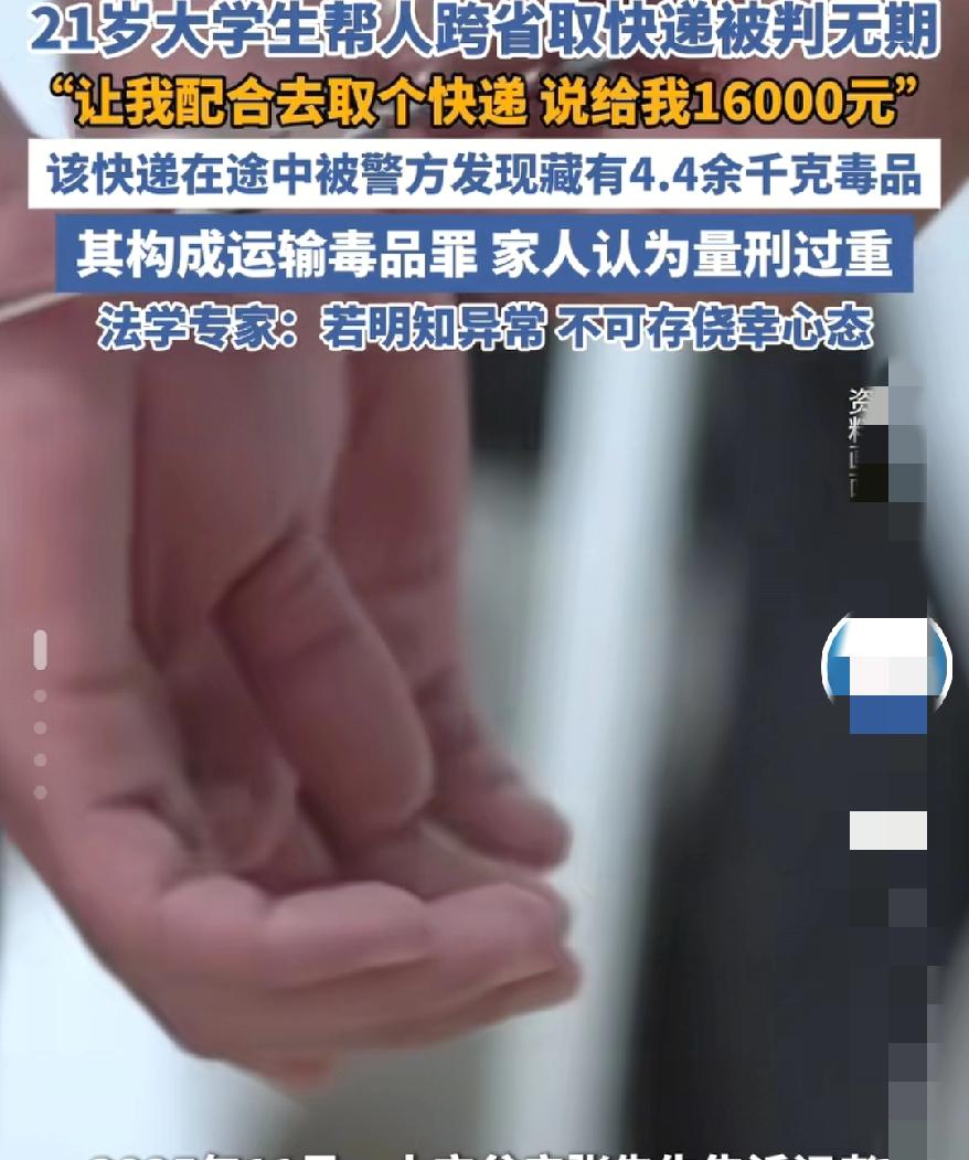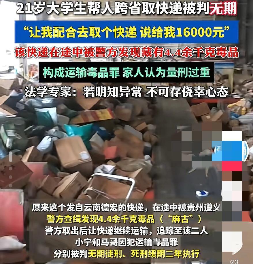 河北这位妈妈 哭诉快要撑不住了 他儿子为了1.6万跑腿费,结果触犯了法律,被判了无期。 21岁河北大二男生小宁,就因为帮“李哥”跨省取个快递,拿了远超正常报酬的1.6万,结果包裹里藏着4.4公斤毒品,终审被判无期。 他说自己感觉包裹不对劲,却没敢多问,是被这个巨额跑腿费诱惑了吗?天上掉的高薪馅饼,大概率是裹着风险的陷阱。 法律认定运输毒品,不光看是否明知,高额报酬、诡异叮嘱这些“异常信号”,都是定罪的关键。 年轻人想赚外快没毛病,但不能丢了警惕心,这一下子,让家里人崩溃,自己也丢了大好前程。 你觉得该怎么帮年轻人避开这类“高薪陷阱”?是加强普法还是严控兼职渠道?来评论区聊聊!快递以罚代管 未成年人寄快递 跨省快递费用 法律