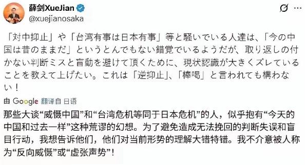 中国驻日本大阪总领事薛剑:又“亮剑”了!   近日,薛剑再次发文写道:“那些大谈‘威慑中国’和‘弯湾危机等同于日本危机’的人,似乎抱有‘今天的中国和过去一样’这种荒谬的幻想。为了避免造成无法挽回的判断失误和盲目行动,我想告诉他们,他们对当前形势的理解大错特错。我不介意被人称为‘反向威慑’或‘虚张声势’。”   这条社交媒体信息并不仅仅停留在文字警告。紧接着,薛剑发布了一组中国现役海军主力装备的高清图片,其中包括三艘航空母舰和先进的两栖登陆舰。   这不是普通的军情新闻,而是一种直白的展示——让对方看到事实,明白中国的军力早已不同于过去,这种带着分量的“亮剑”,其实是在用让对方听得懂的语言传达一个清晰的信号:不要基于过时的判断去行动,否则很可能犯下无法弥补的错误。   从内容来看,薛剑的用意显而易见,这并不是要和日本“口水战”,而是一次针对性的提醒。他用极为直观的方式,让那些鼓吹“威慑中国”的声音面对现实。   给日本的提示并不复杂:中国有能力、有决心维护自己的利益,一旦被误判,后果不是口头交流能解决的,这样的公开展示,既是对外的震慑,也是减少误判风险的一种方法。   在国内,这次“亮剑”引起了强烈共鸣。大量网友称这是有必要的行动,认为先进装备在需要的时候就该亮出来,不必躲躲藏藏。   这种看法代表了不少人的心声——实力不是为了炫耀,而是为了让别人明白,中国的和平立场建立在可被验证的实力之上,民众的这种支持,也让这种更直接、更有冲击力的外交方式有了坚实的舆论基础。   如今的外交环境中,传统的含蓄话术有时已经不足以应对快速变化的局势,薛剑的做法跳过了繁琐的解释,用图片加简单明了的文字,直截了当地表达立场,这不仅提高了信息传递的效率,也让对方没有理由曲解中国的意思。   其实在涉及核心利益和安全的问题上,清楚、坚定,有时比委婉更能防止不必要的冲突。   这种做法的意义在于,用透明和强硬去消除侥幸心理,让潜在的摩擦尽量停在萌芽阶段,对国家来说,这是一种防患于未然的主动姿态,也是新时代外交方式的一个案例。事实证明,当立场和实力摆在眼前,信息比任何外交辞令都更有分量。