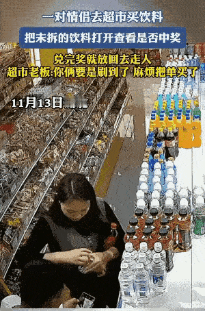 配合默契的情侣 看了这个视频,真是让人大开眼界。这是一对情侣,在超市里,把饮料瓶打开,一个个看看有没有中奖,有中奖的直接在手机上扫码操作中奖,然后把开过盖的饮料放在原处。 这个操作真是让人无语,这两个情侣真是太聪明了,光天化日之下,两个人一起在超市里,明目张胆地开饮料瓶,真是胆大妄为。 先不说这个饮料对奖的事情,主要问题是这个饮料被她开盖后,饮料跑气了,封闭不严了,还能喝吗?谁买到这瓶饮料,喝了对身体造成不适怎么办? 这对情侣,咋那么爱贪小便宜,一个小小的奖励,都能看上,这是多么爱财的人。 什么是情投意合?这对情侣就是真正的情投意合,兴趣相同,价值观方面高度契合,配合默契。能够产生共鸣和一致的想法。 这样的情侣,如果继续在超市里这样做,总有一天会露馅。俗话说,常在河边走,哪有不湿鞋。等到抓住他们的时候,看他们怎么做人。 朋友们,你们对这对情侣怎么看?欢迎讨论! 声明(视频来源于网络,侵权联系删除)